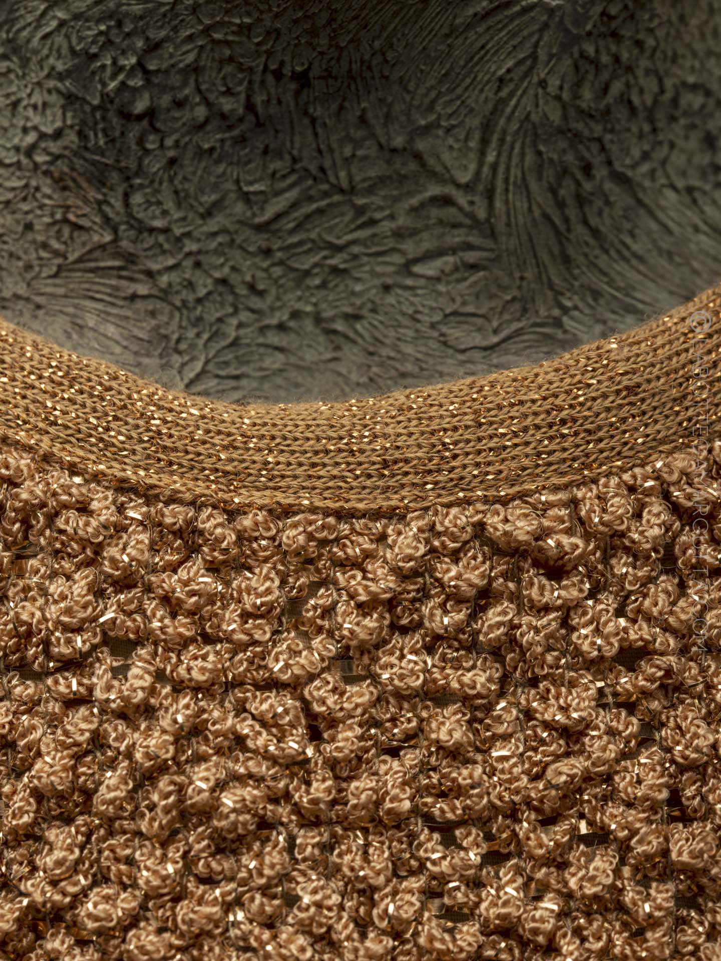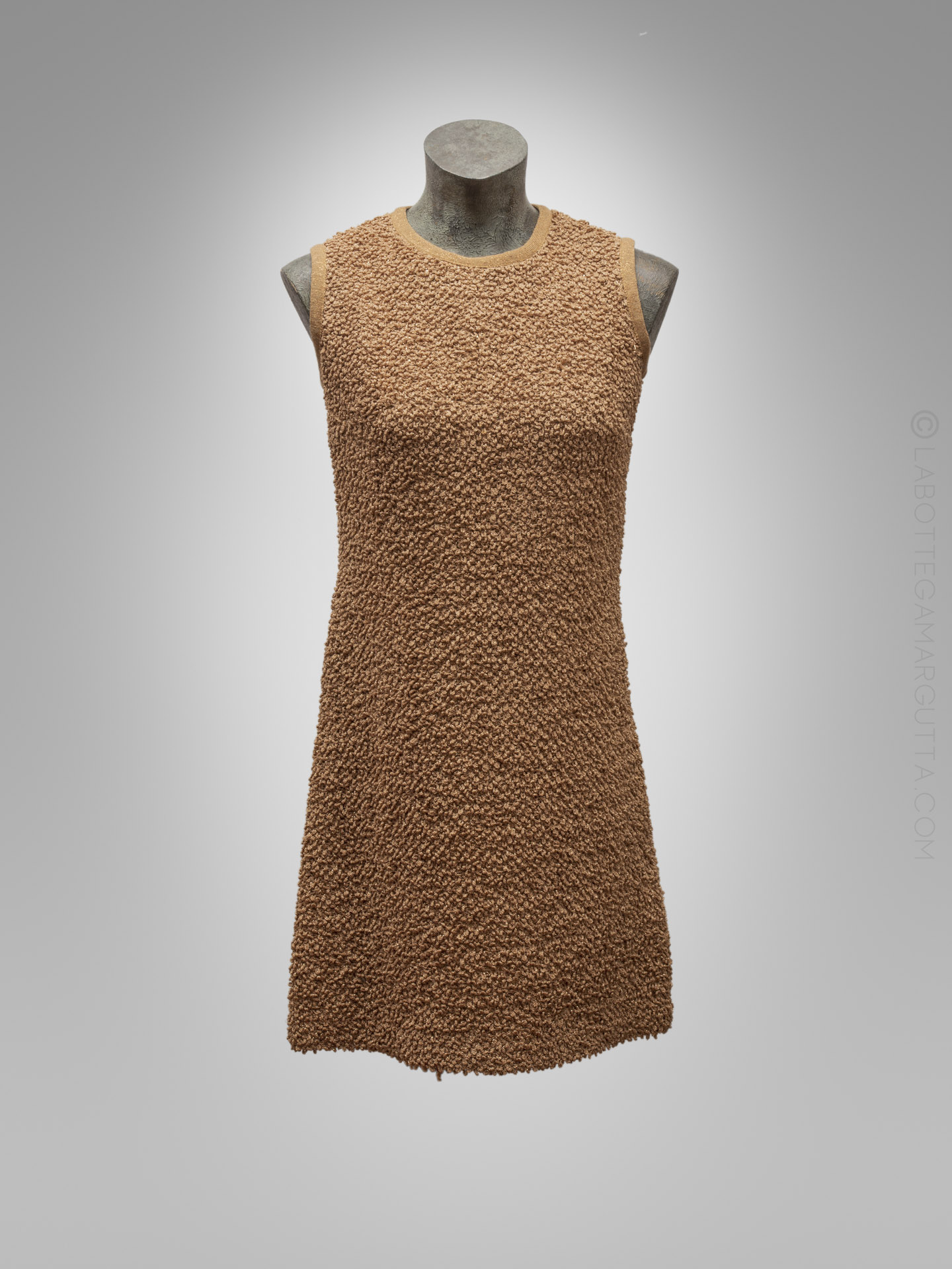 Abito da cocktail in maglia bouclè laminata color bronzo.