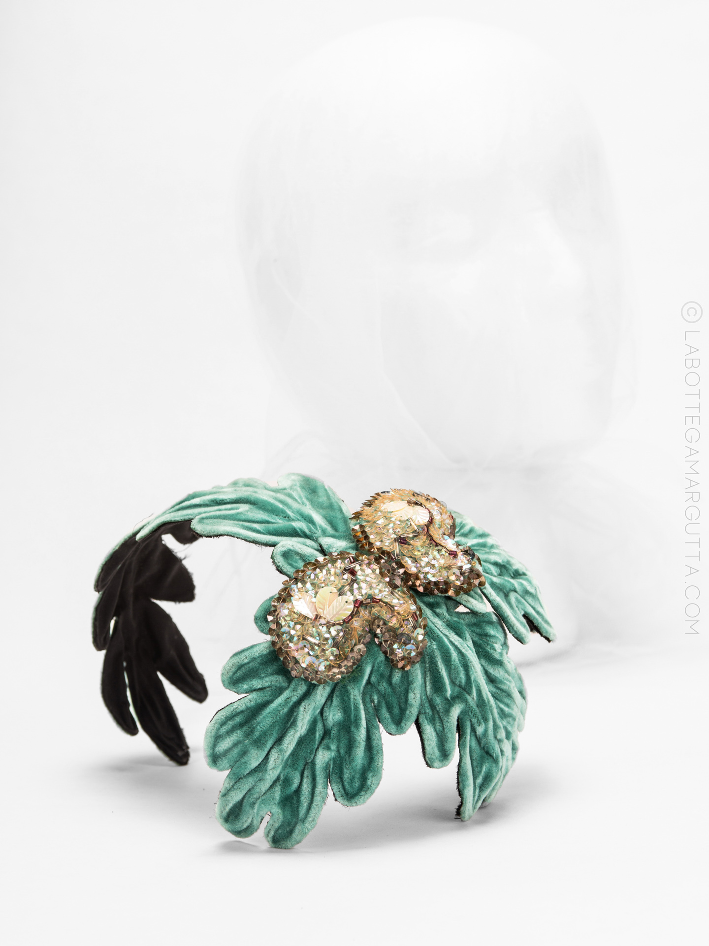 Acconciatura da sera in velluto turchese e paillettes
