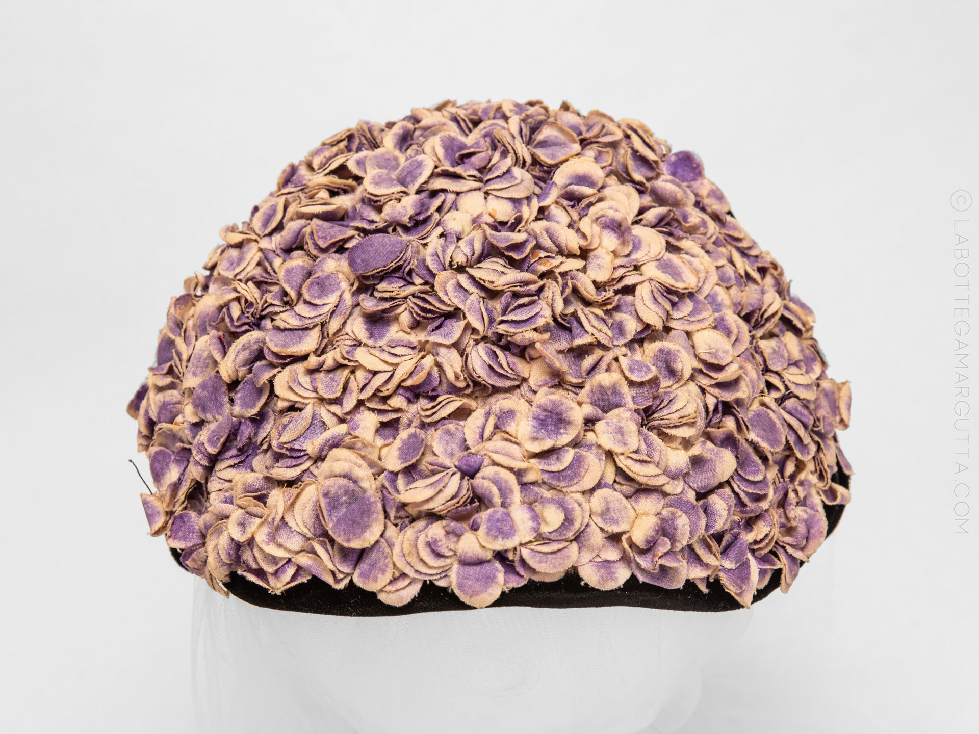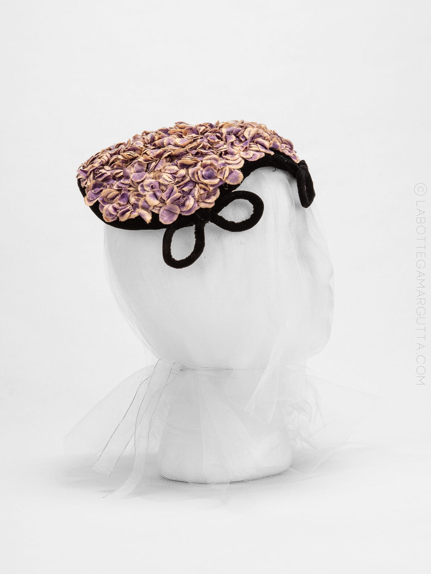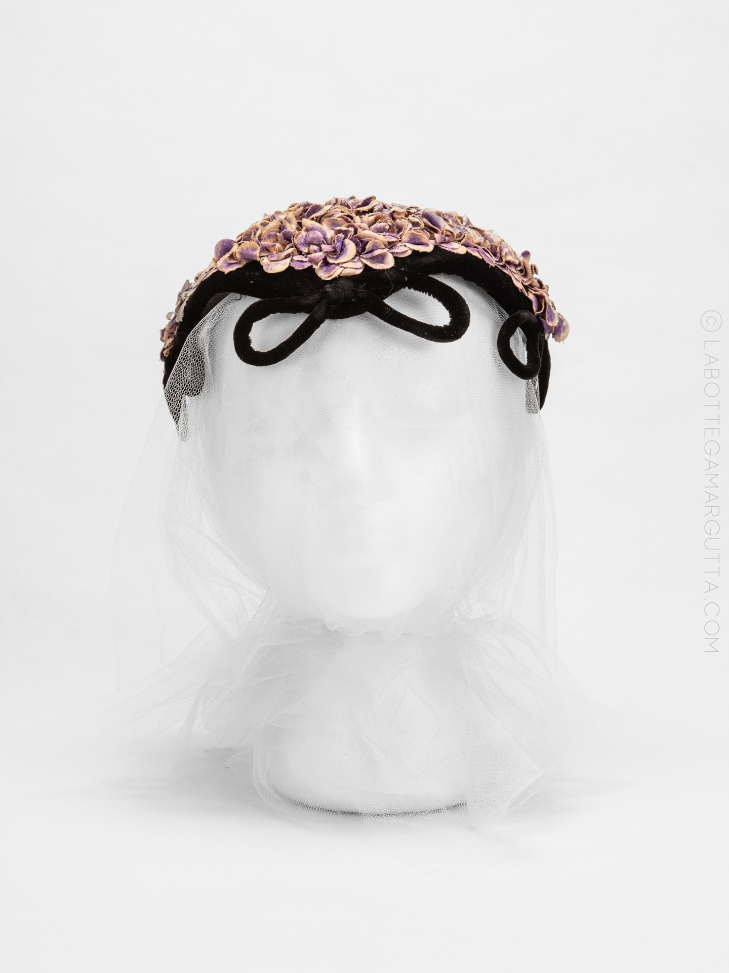 Acconciatura in petali di ortensia rilegati in velluto nero