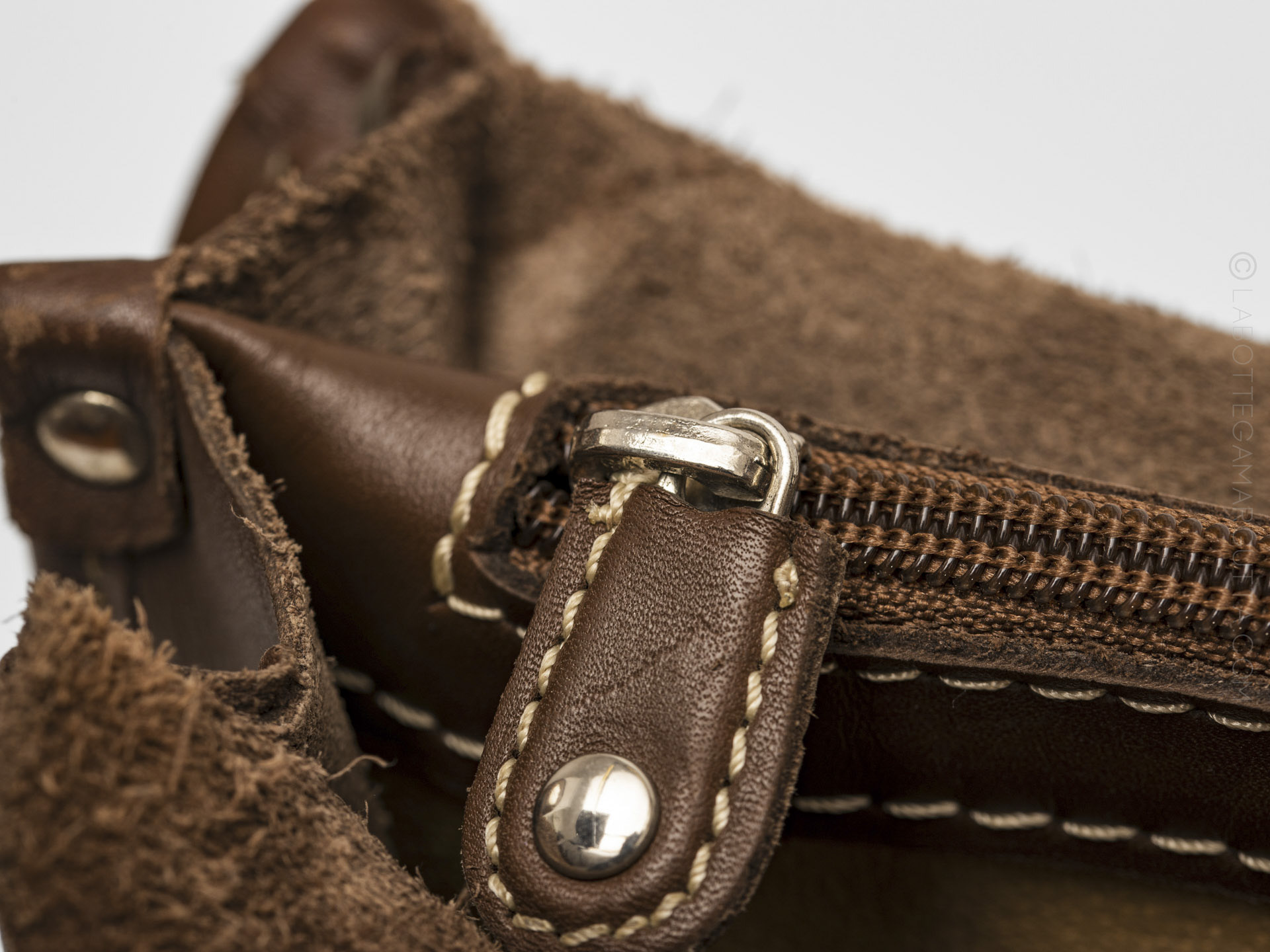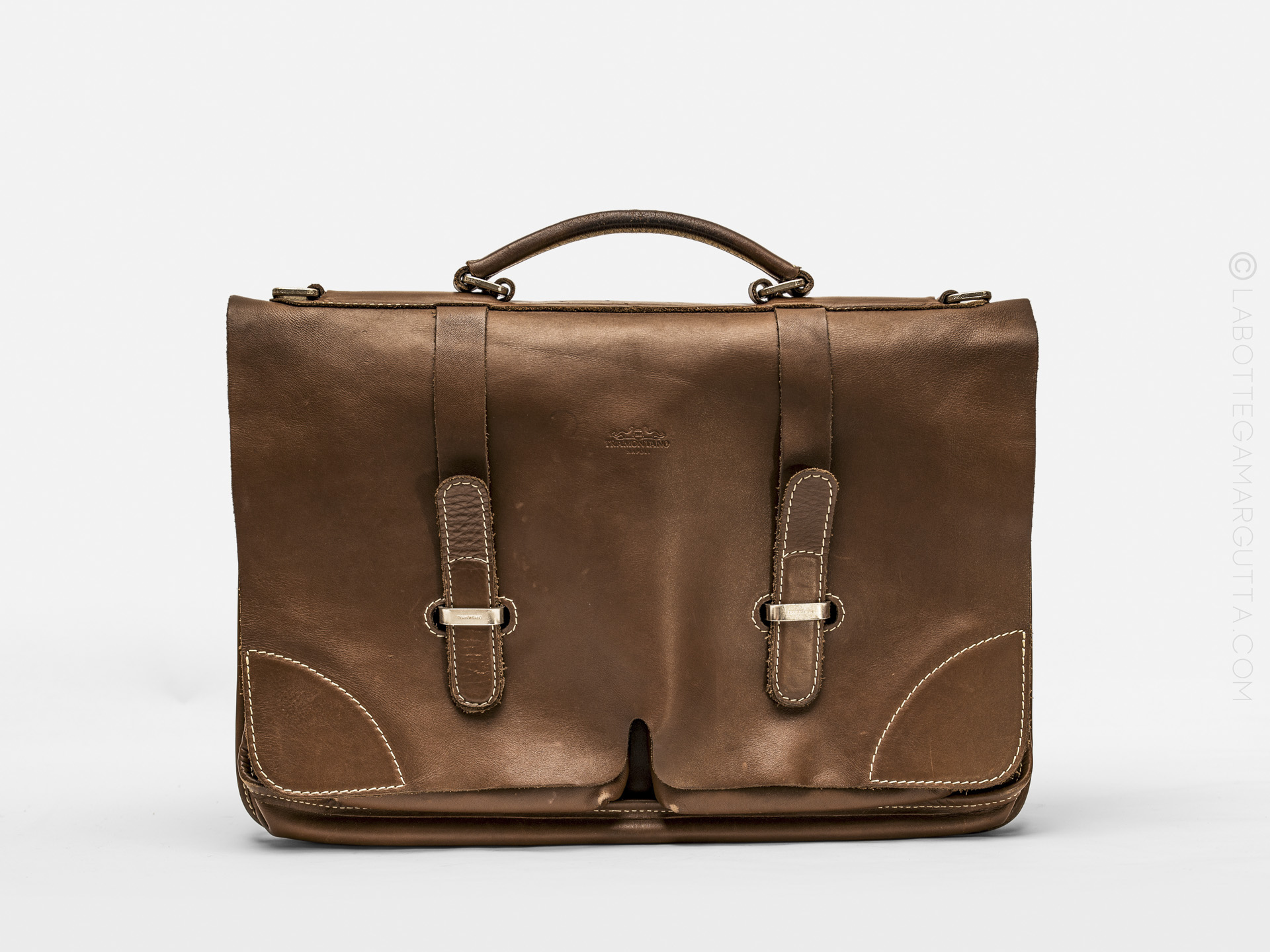 Cartella da lavoro in cuoio completamente sfoderato marron glassè con rifiniture in metallo grigio e tracolla. Tutta impunturata a mano