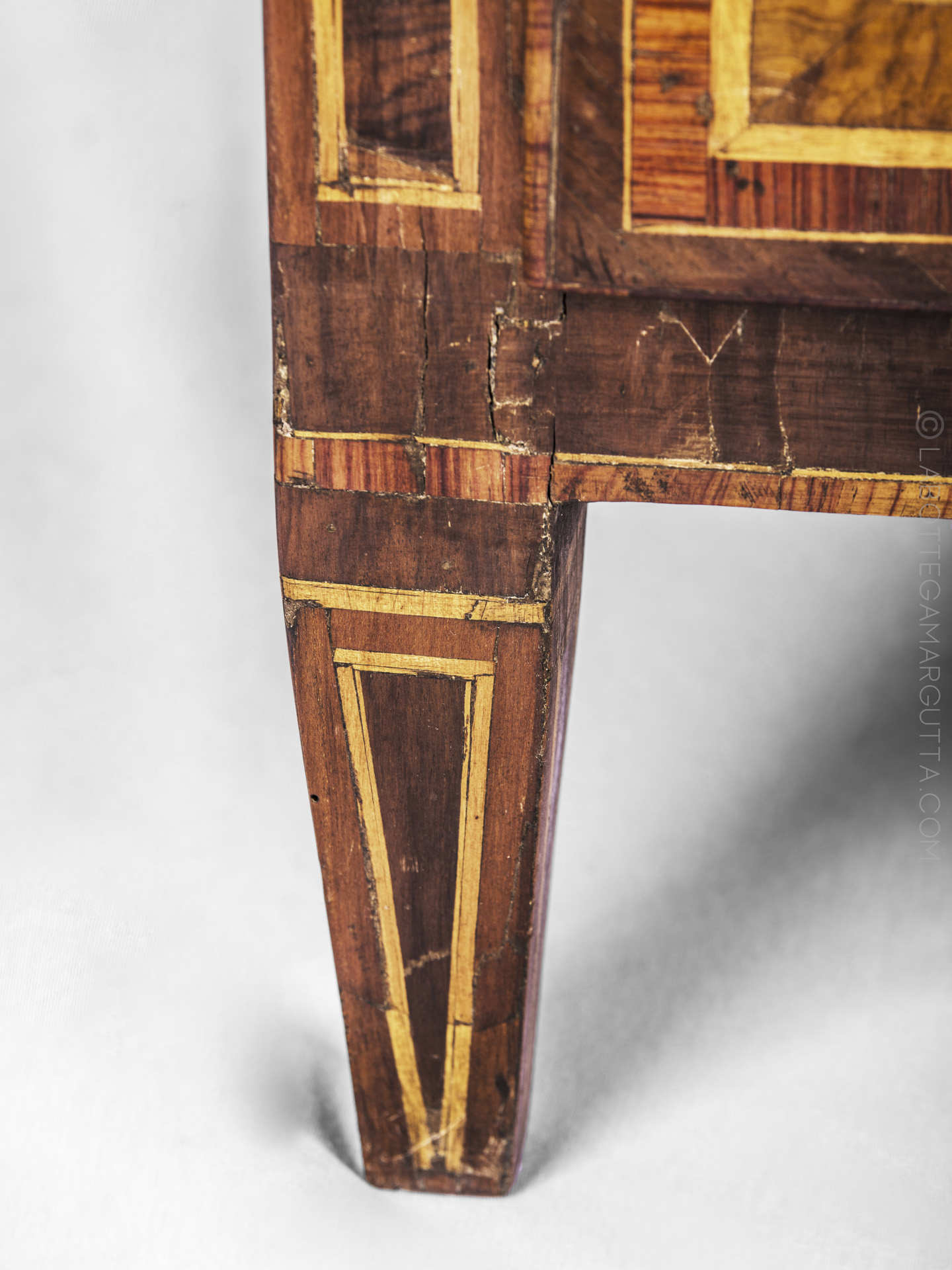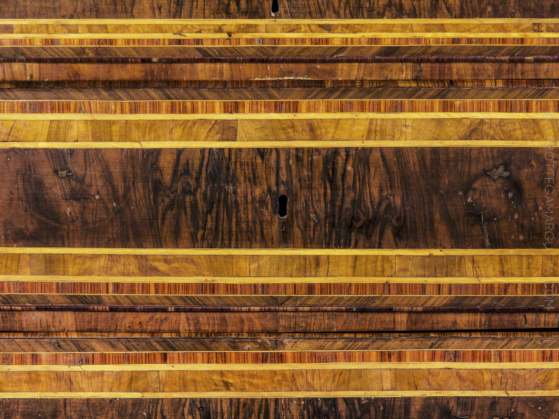 Comoncino in noce, intarsiato e filettato con legni di frutto. Italia centrale, seconda metà ‘700 (necessita di restauro)