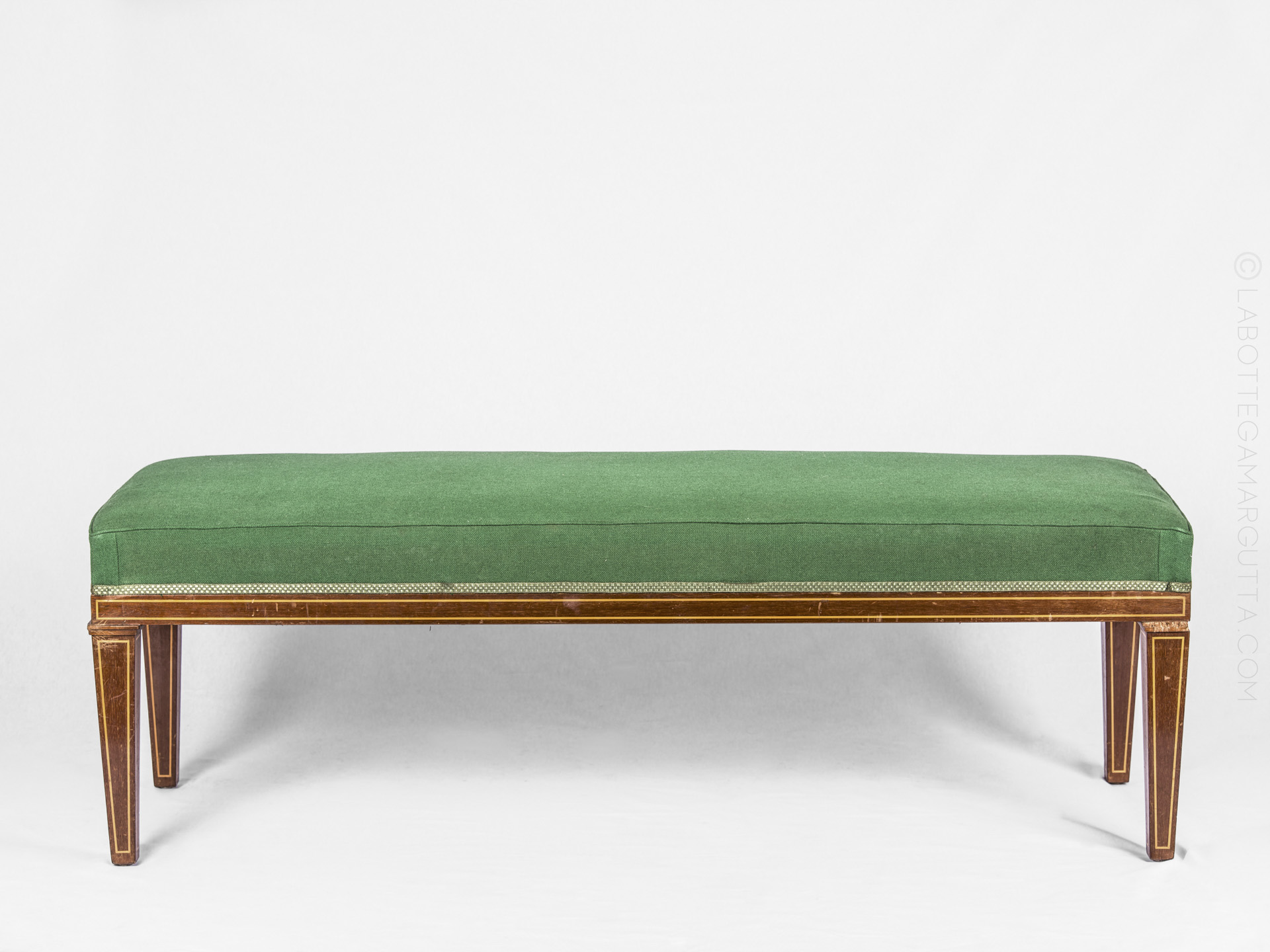Coppia di panchette in mogano filettato, tappezzate. Inghilterra inizi ‘900