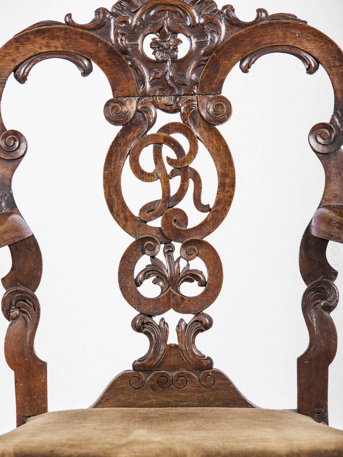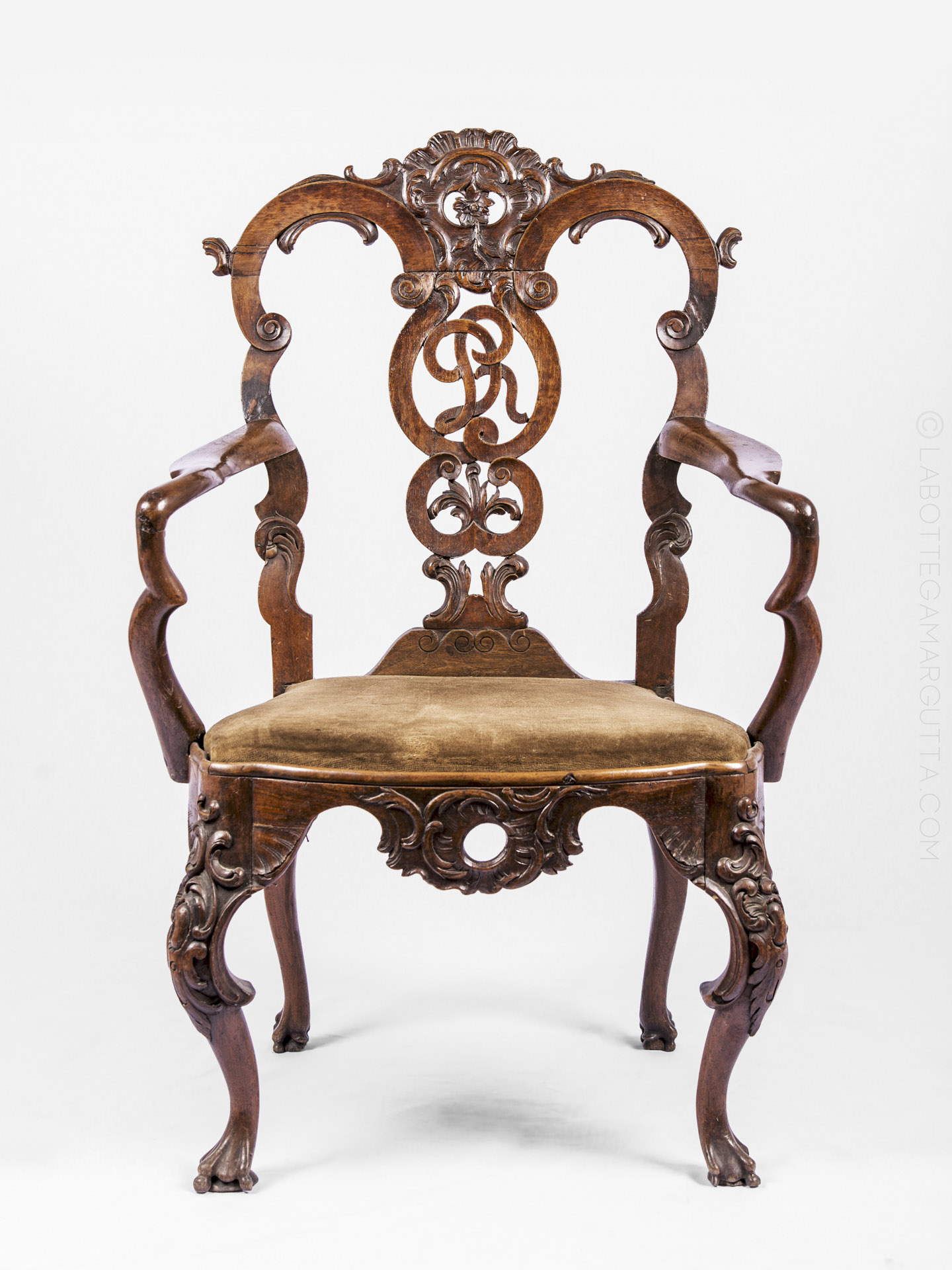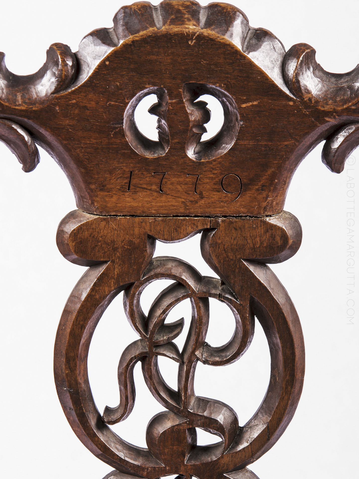 Coppia di poltrone in noce massello intagliato e scolpito. Venezia, sul retro dello schienale è riportata la data 1790