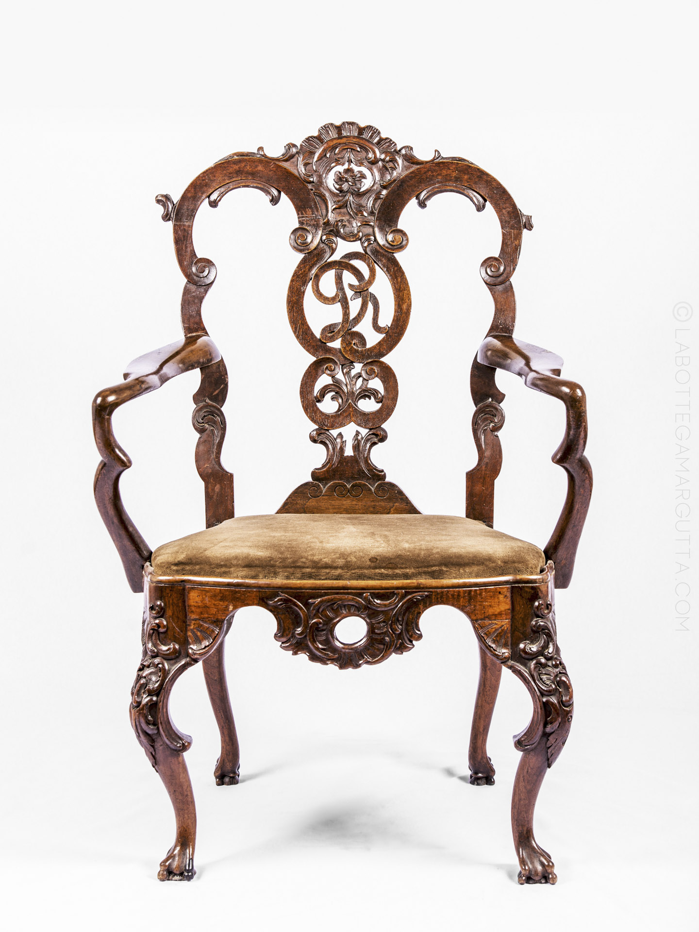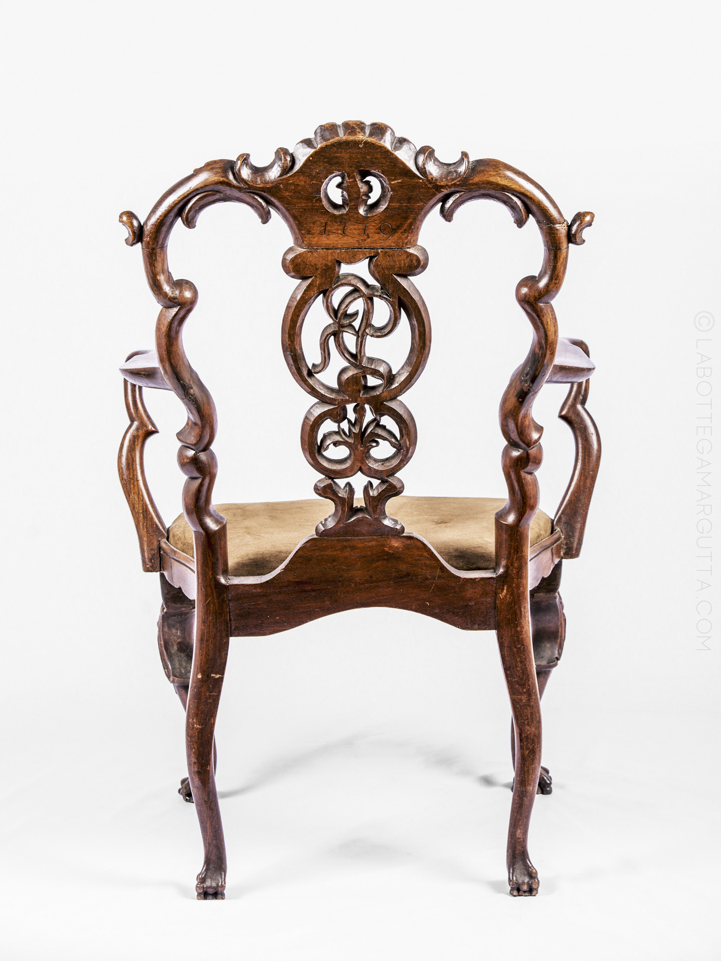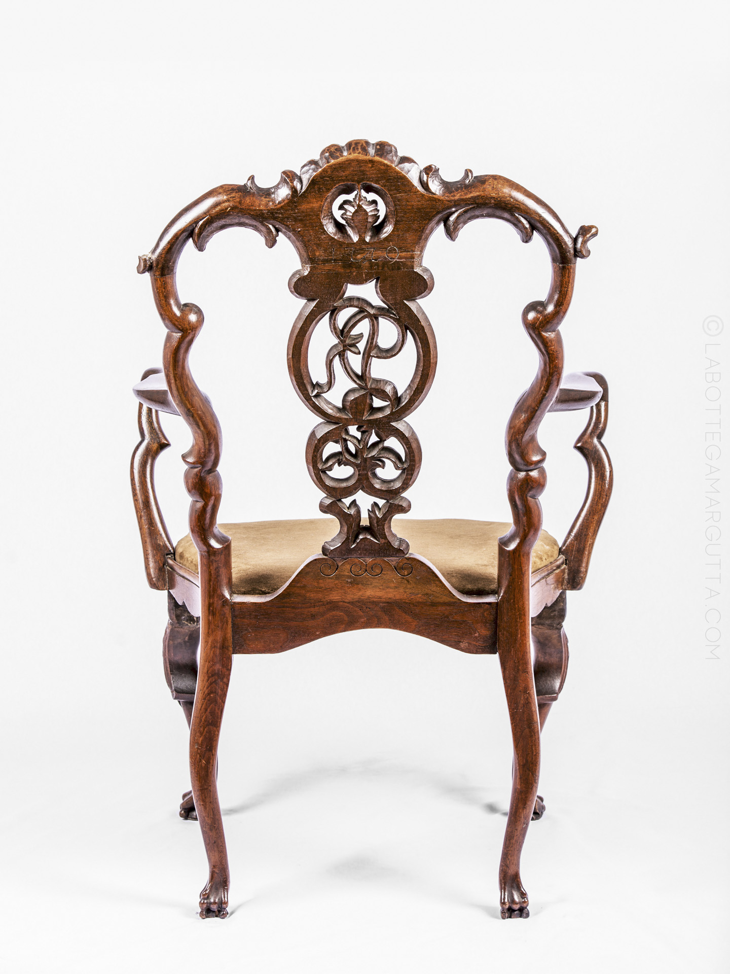 Coppia di poltrone in noce massello intagliato e scolpito. Venezia, sul retro dello schienale è riportata la data 1790