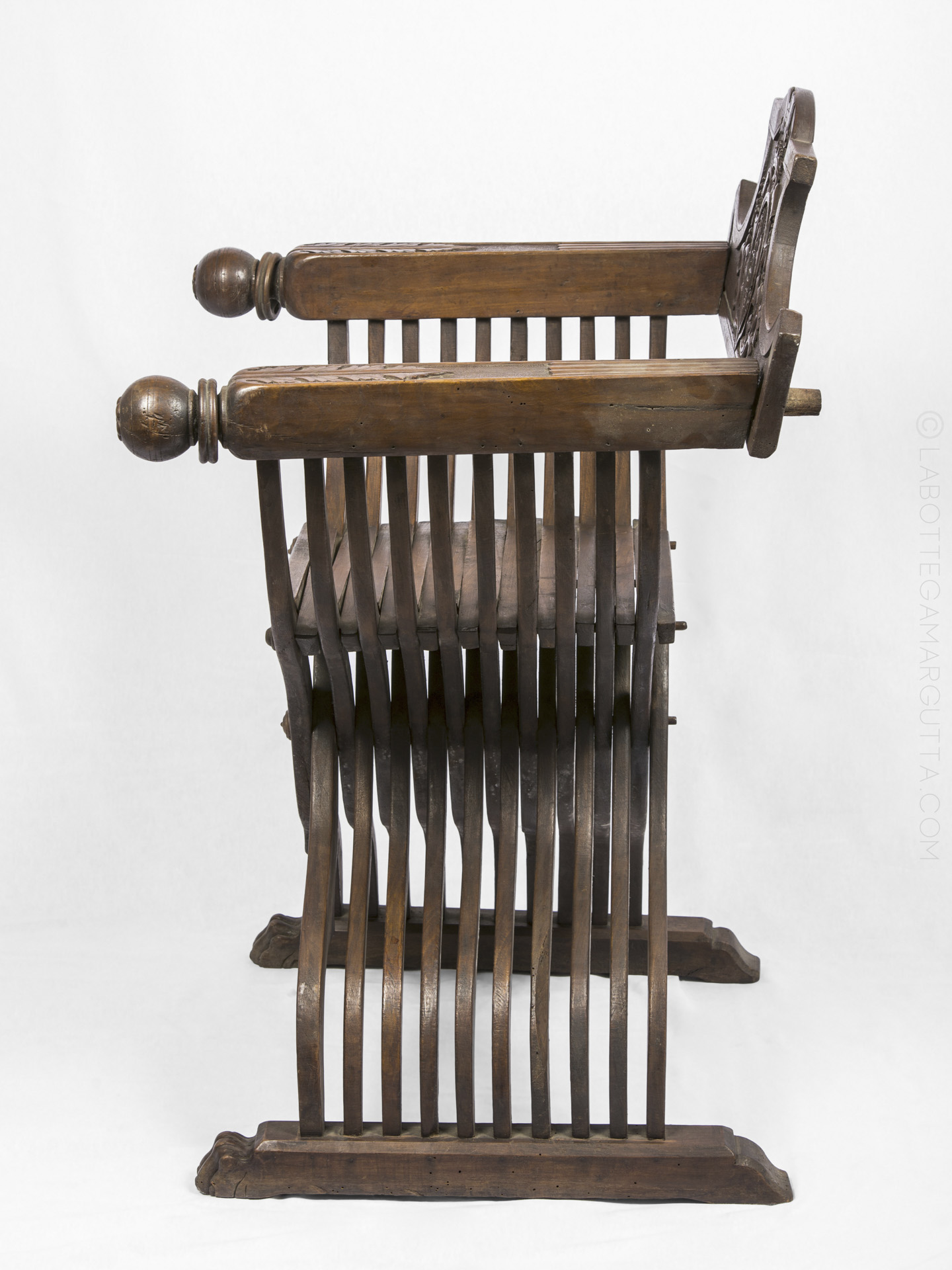 Coppia di seggiole in legno di noce tipo “Savonarola”, pieghevoli con stecche snodabili. Italia, Firenze fine ‘800
