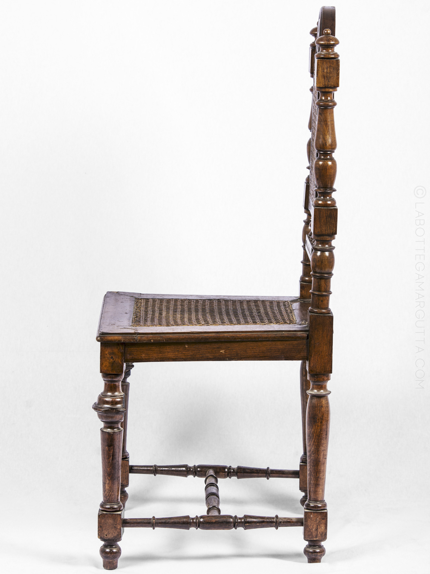 Coppia di seggiole in noce lavorato, seduta e spalliera in cannetè. Italia, Merano, inizio ‘900.