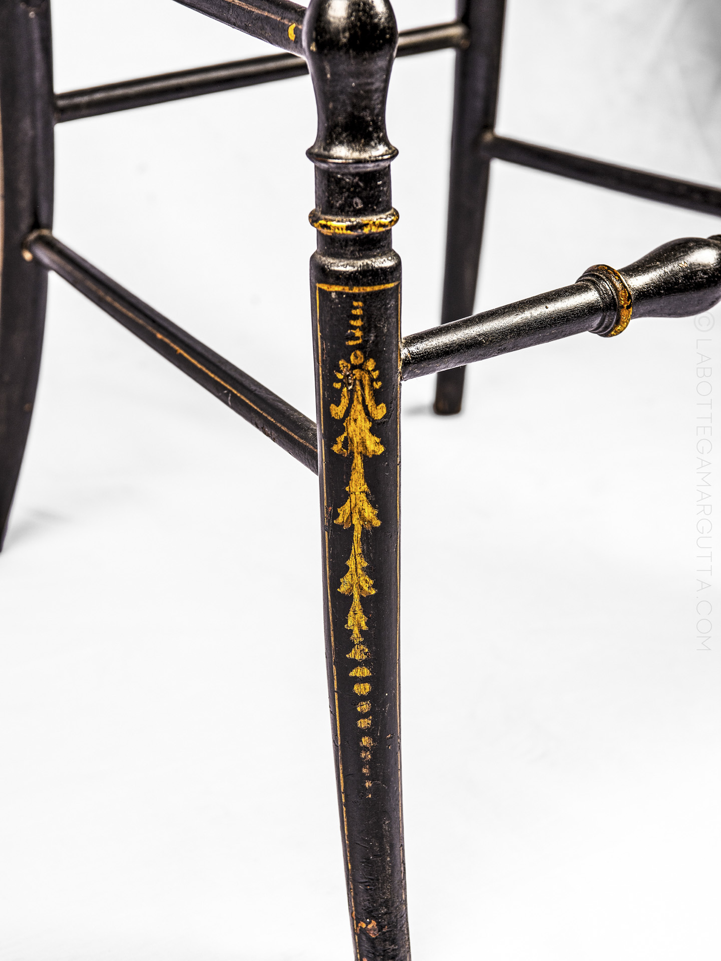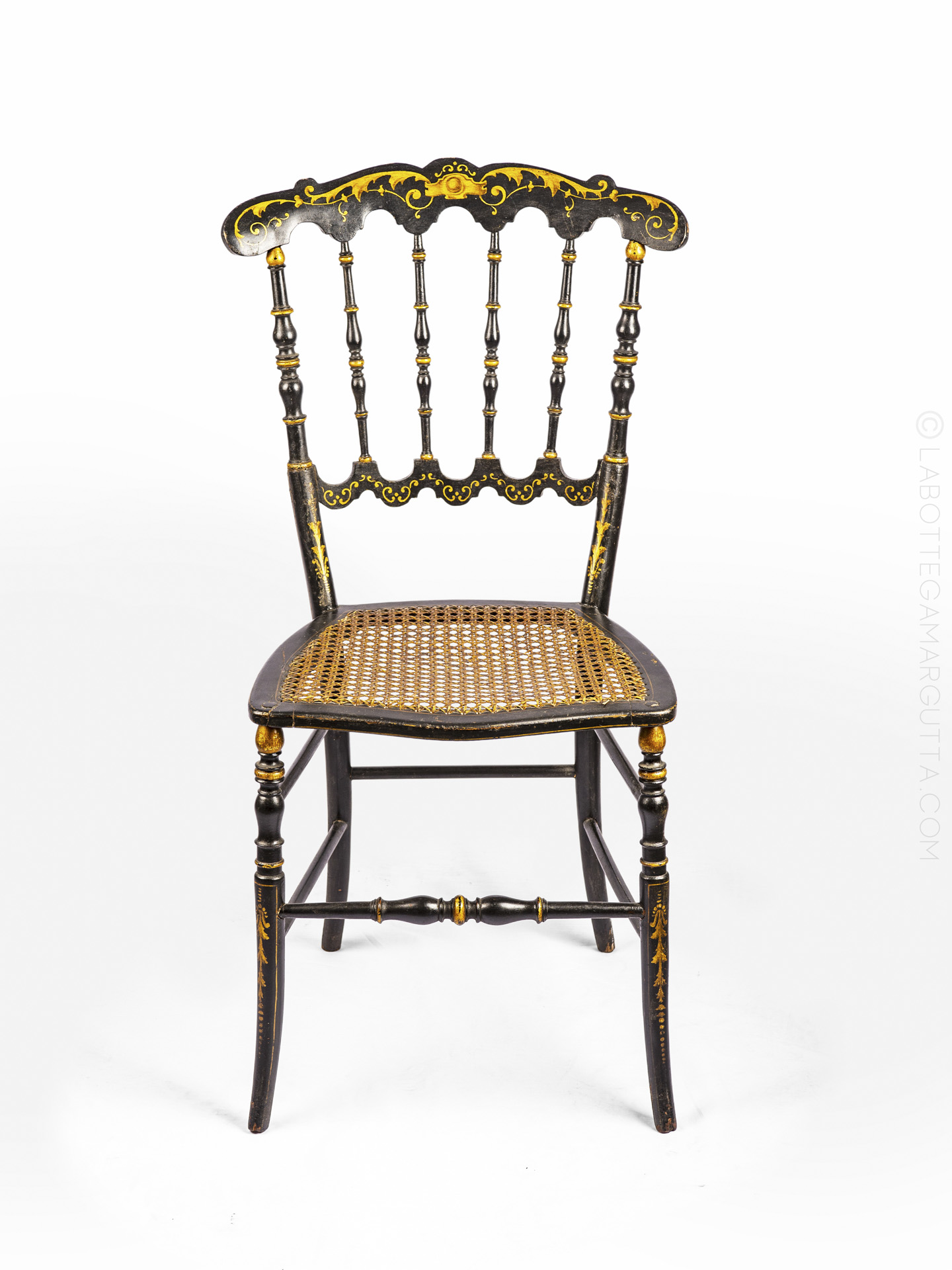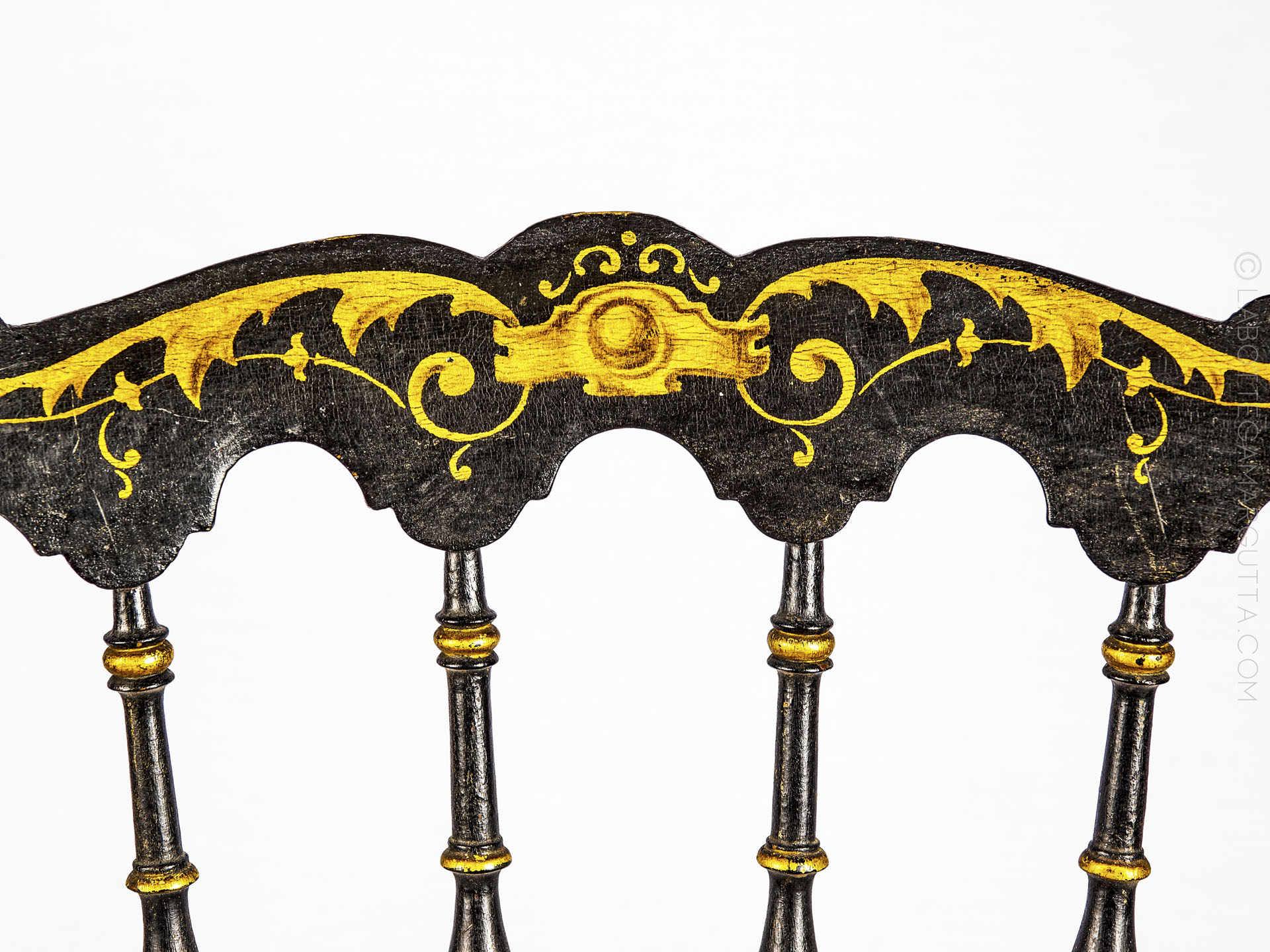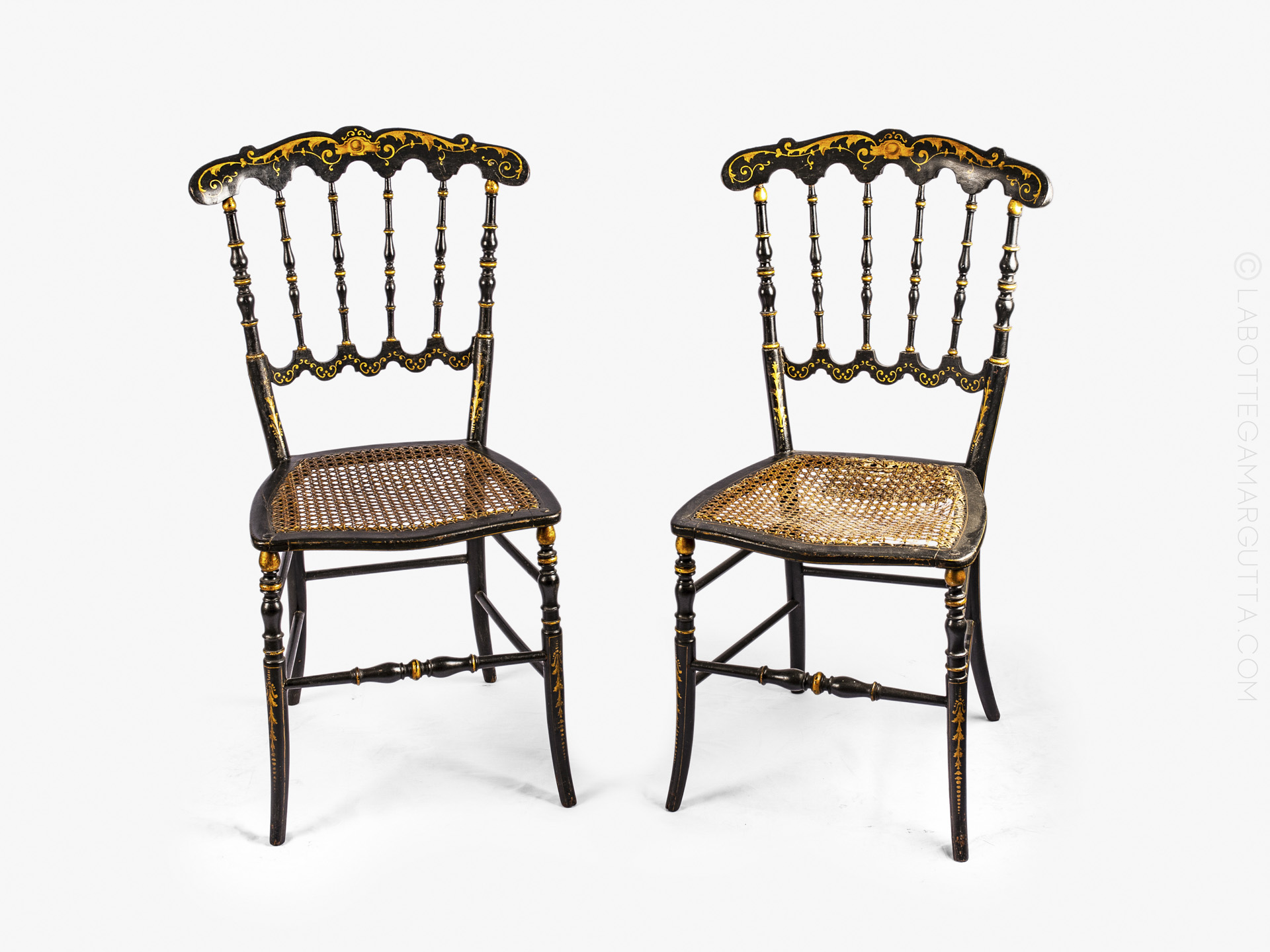 Due seggioline in legno laccato nero e dipinto in oro con seduta in cannetté. (una delle due sedute necessita di restauro)