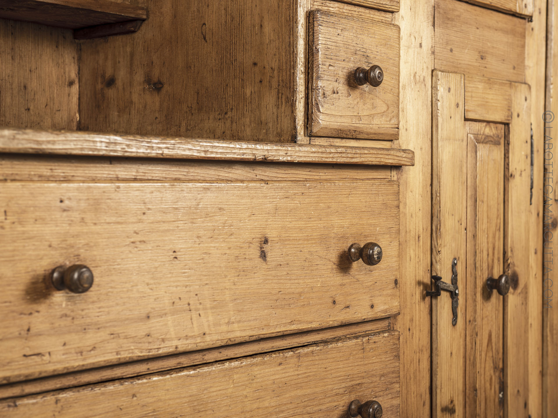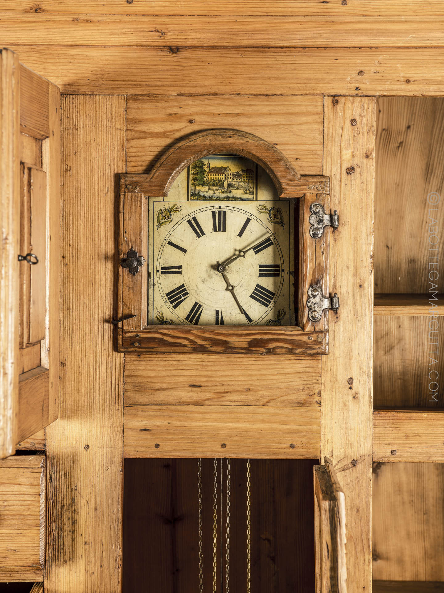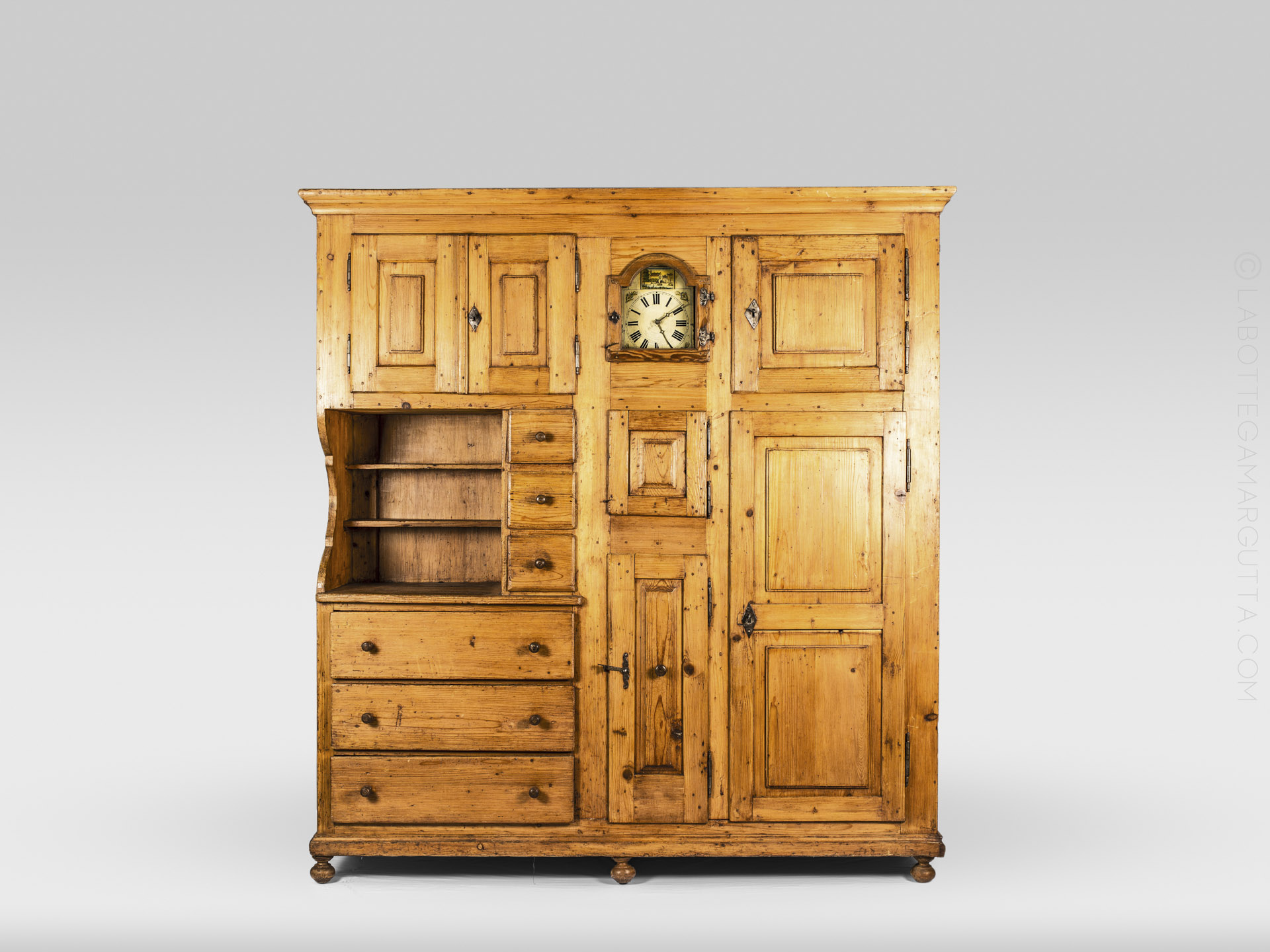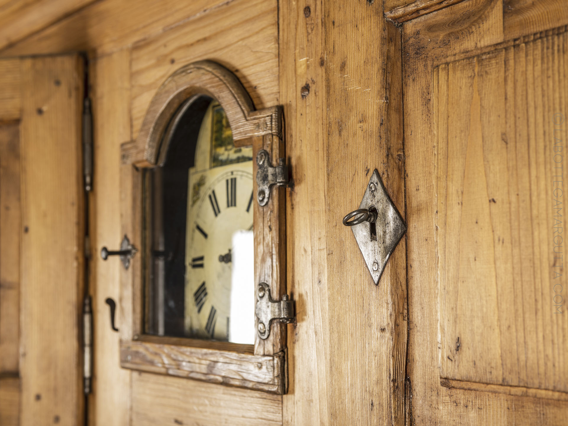 Credenza in abete massello con chiodature in legno originali, e serramenti in ferro originali. Orologio a pendola dipinto incorporato.
