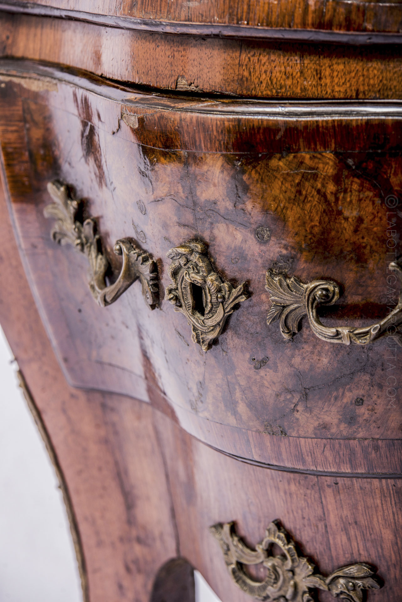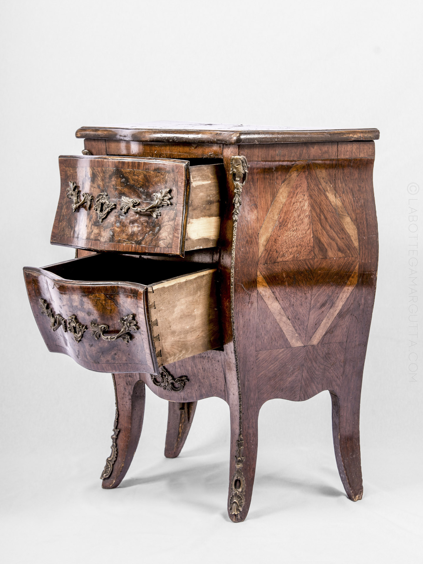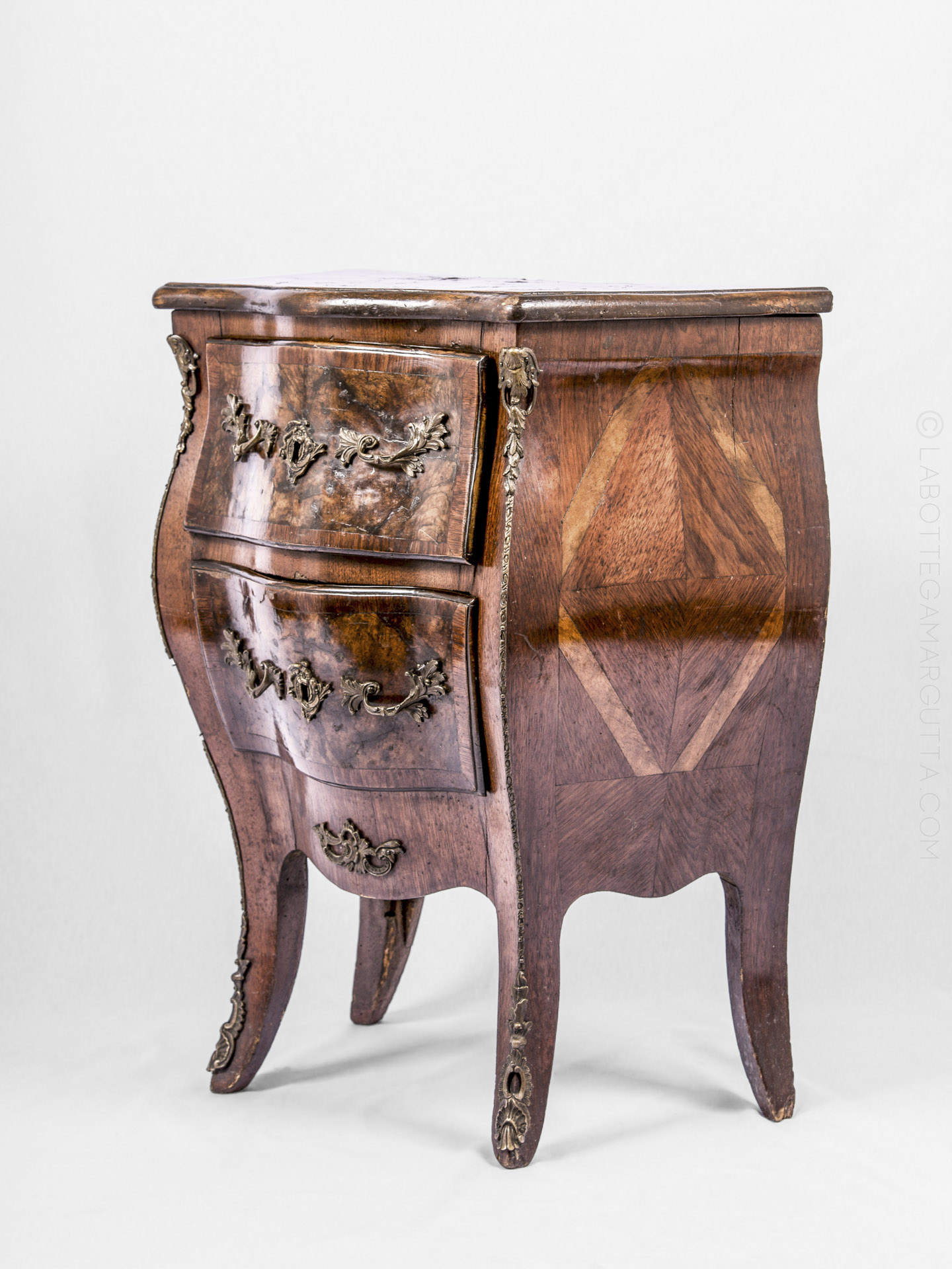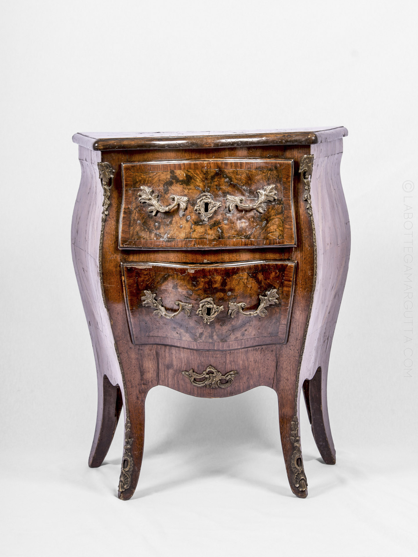 Piccola còmmode in noce placcata. Italia centrale, epoca barocca, fine ‘600 inizi ‘700