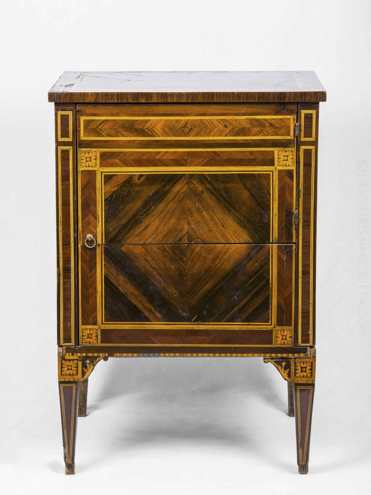 Piccola còmmode in piuma di noce filettata ed intarsiata, con sportello e cassetto estraibile. Italia prima metà ‘700 (necessita di restauro)