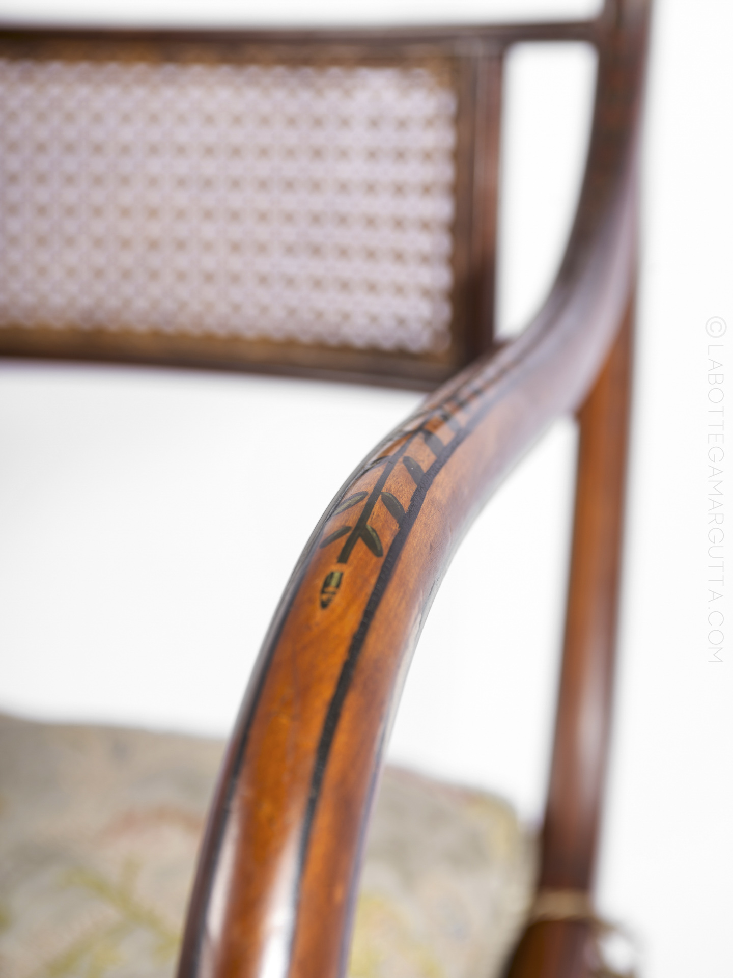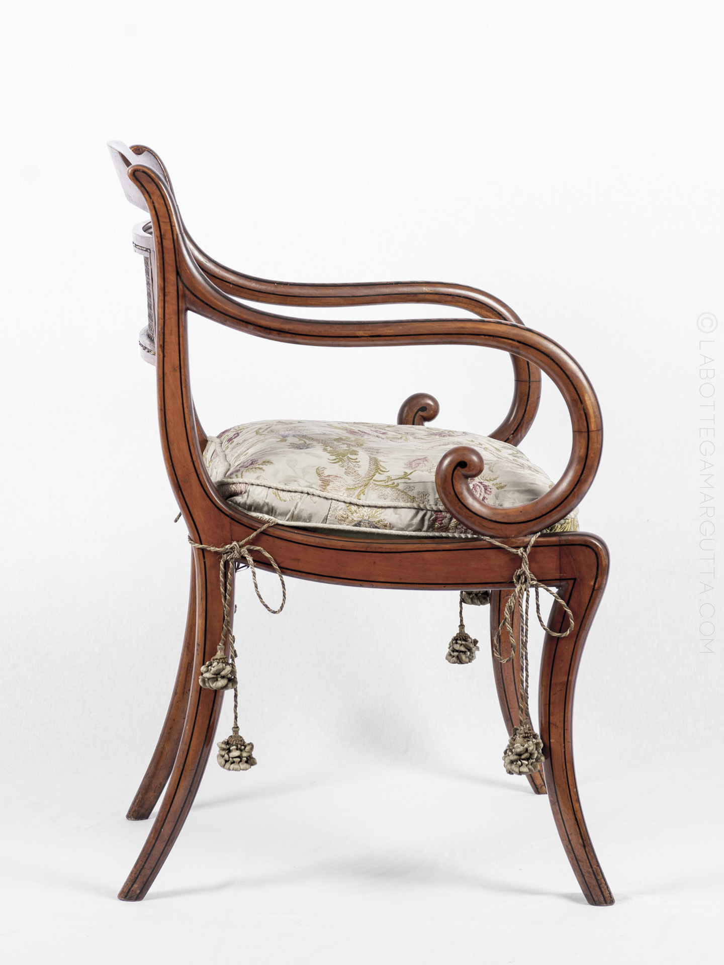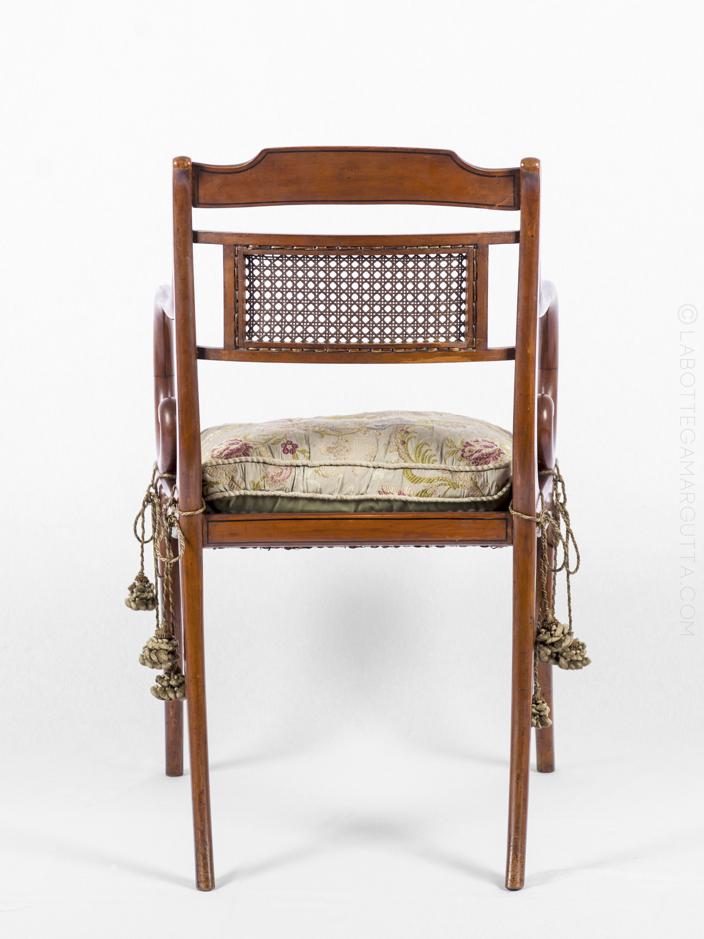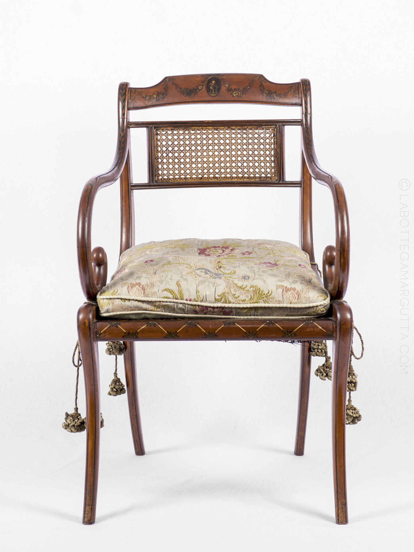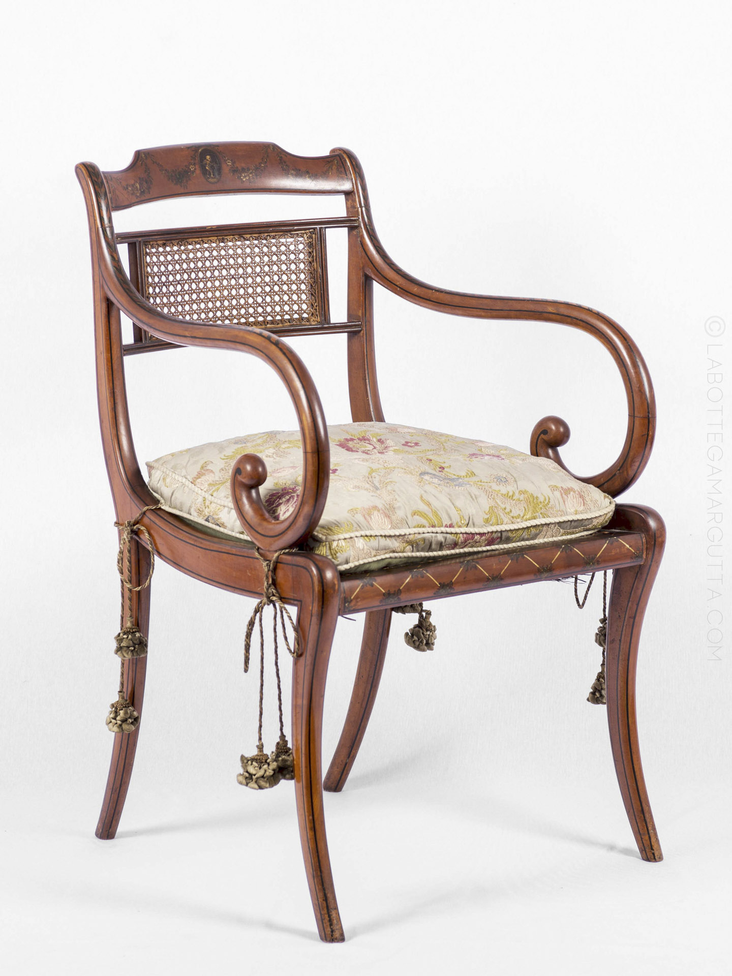 Poltroncina in satinwood dipinto con seduta in cannetè. Inghilterra, fine ‘700