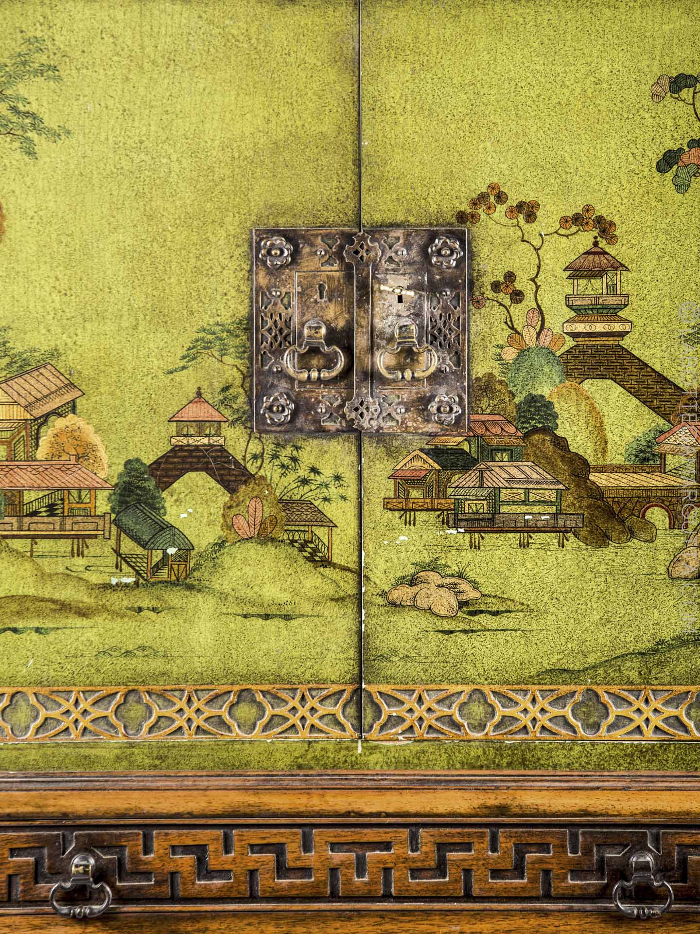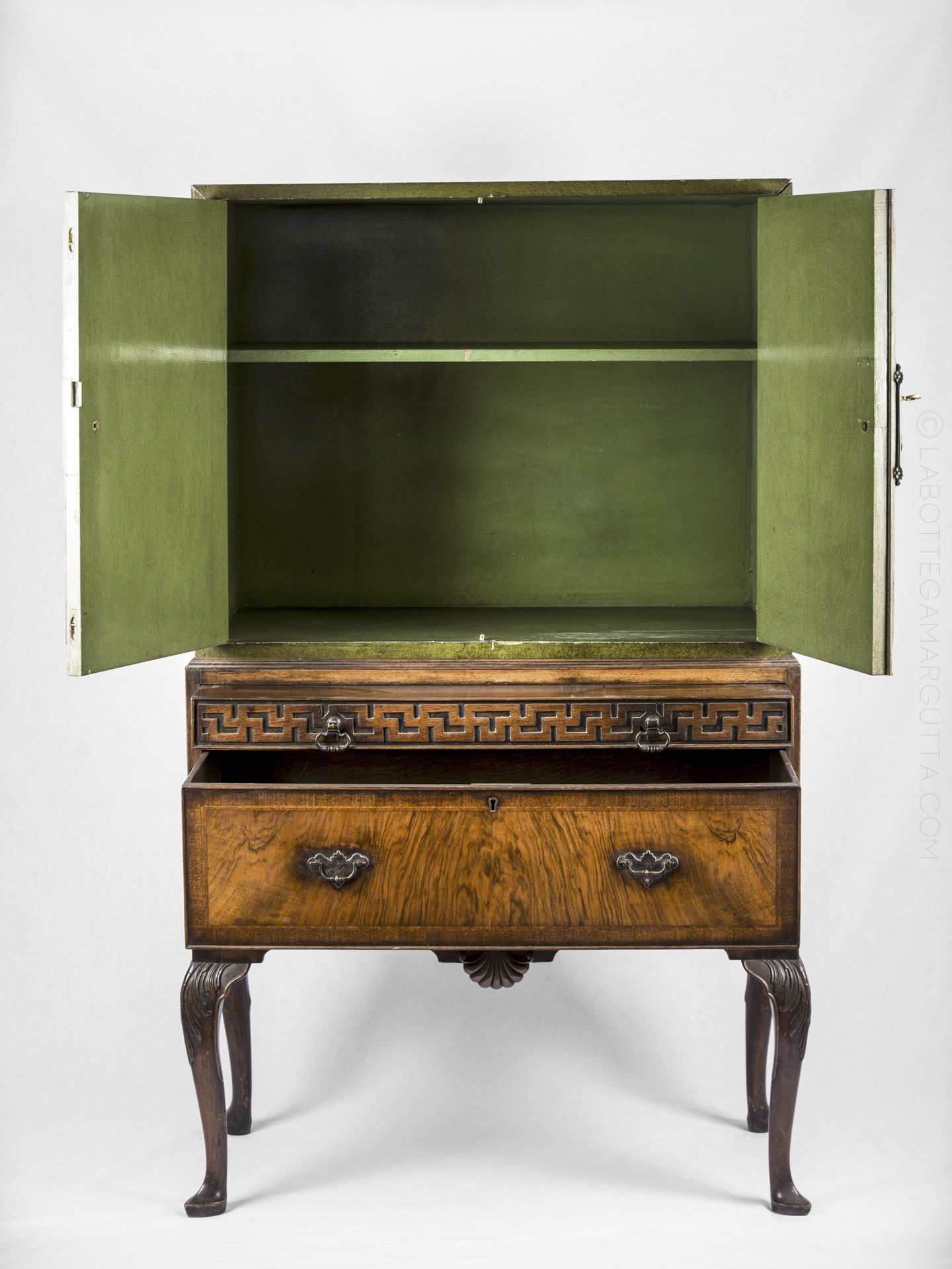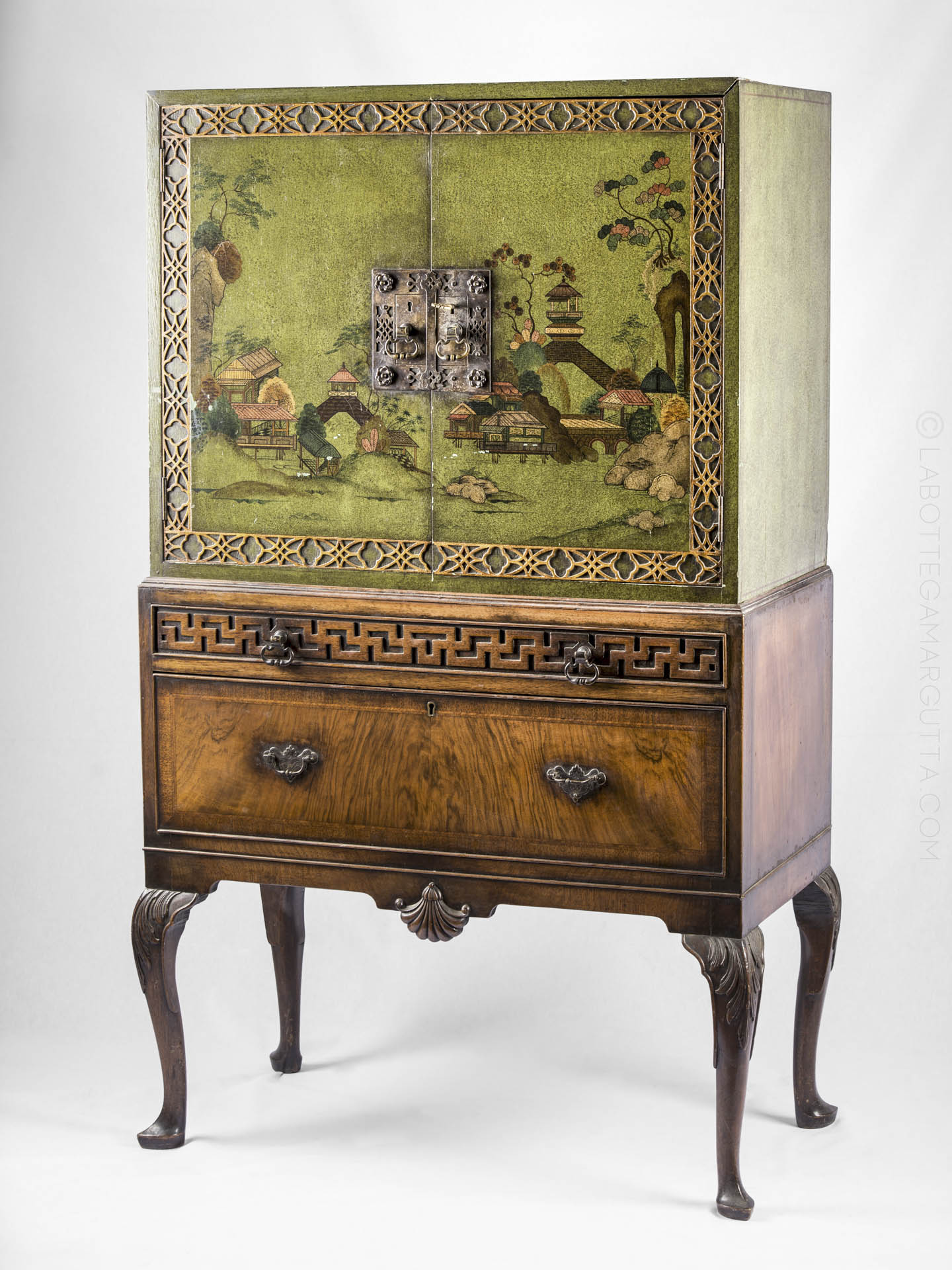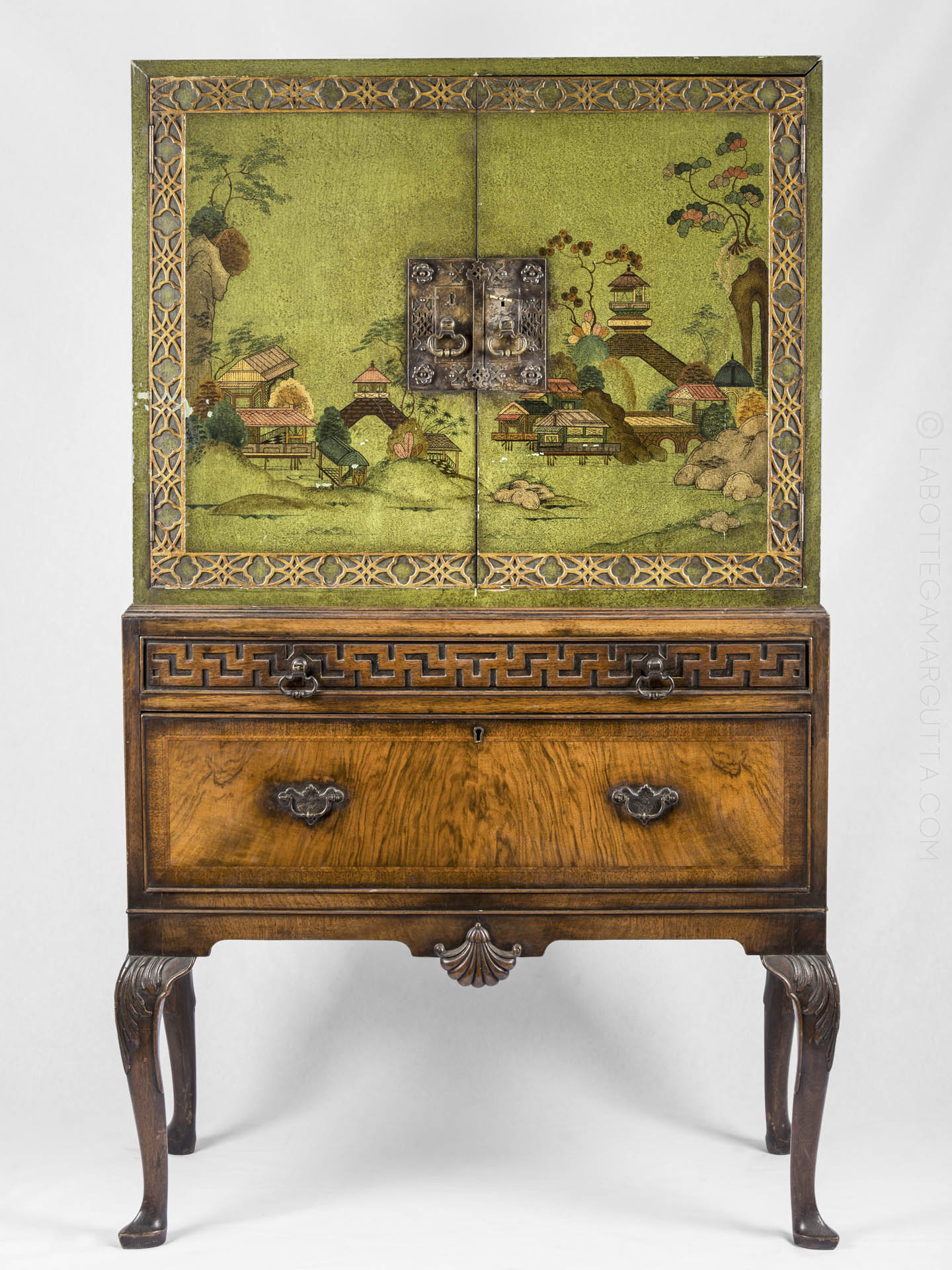 Stipo in mogano laccato verde e dipinto a chinoiseries, con base in legno di mogano. Inghilterra stile Chippendale inizi ‘900