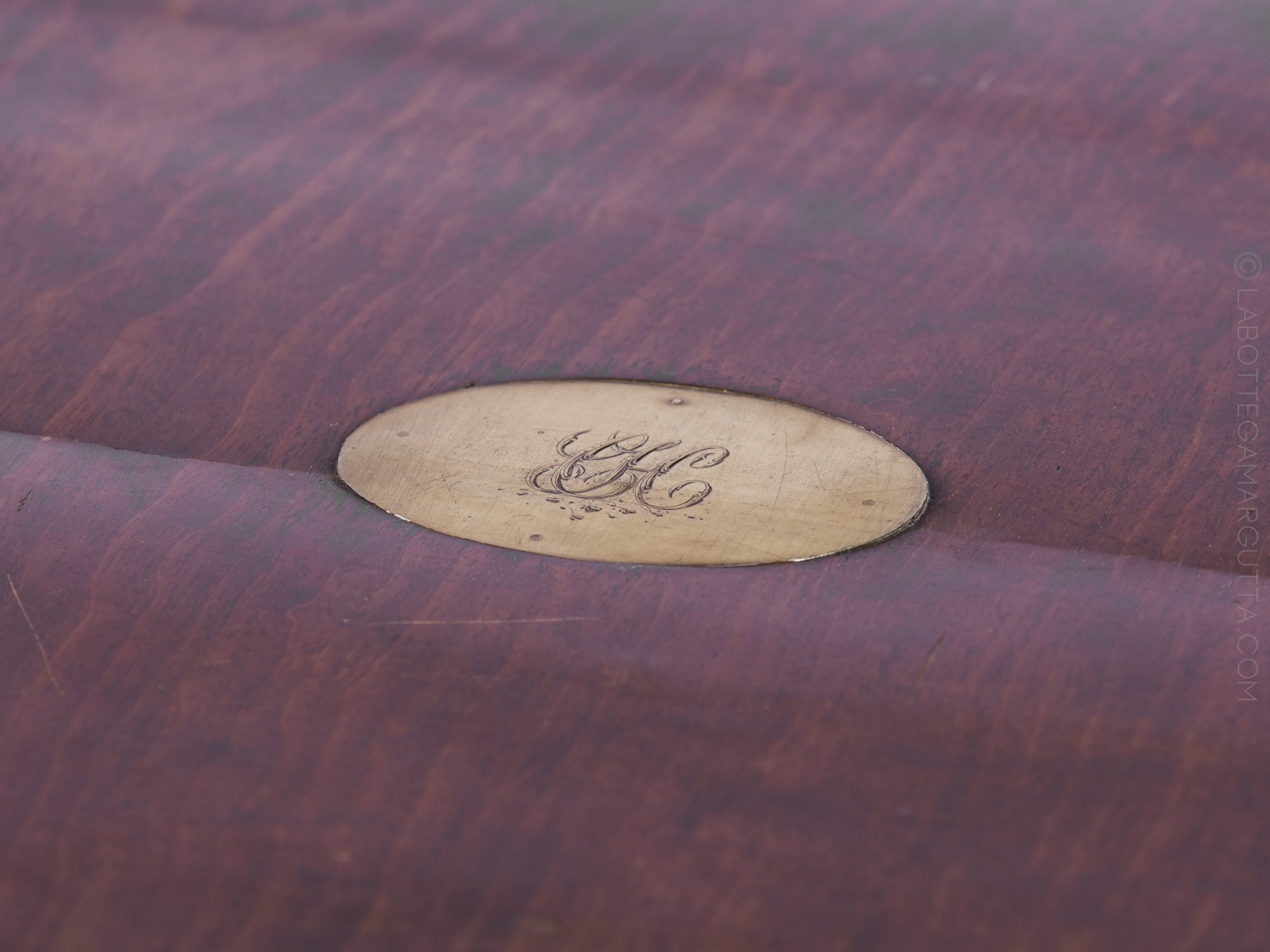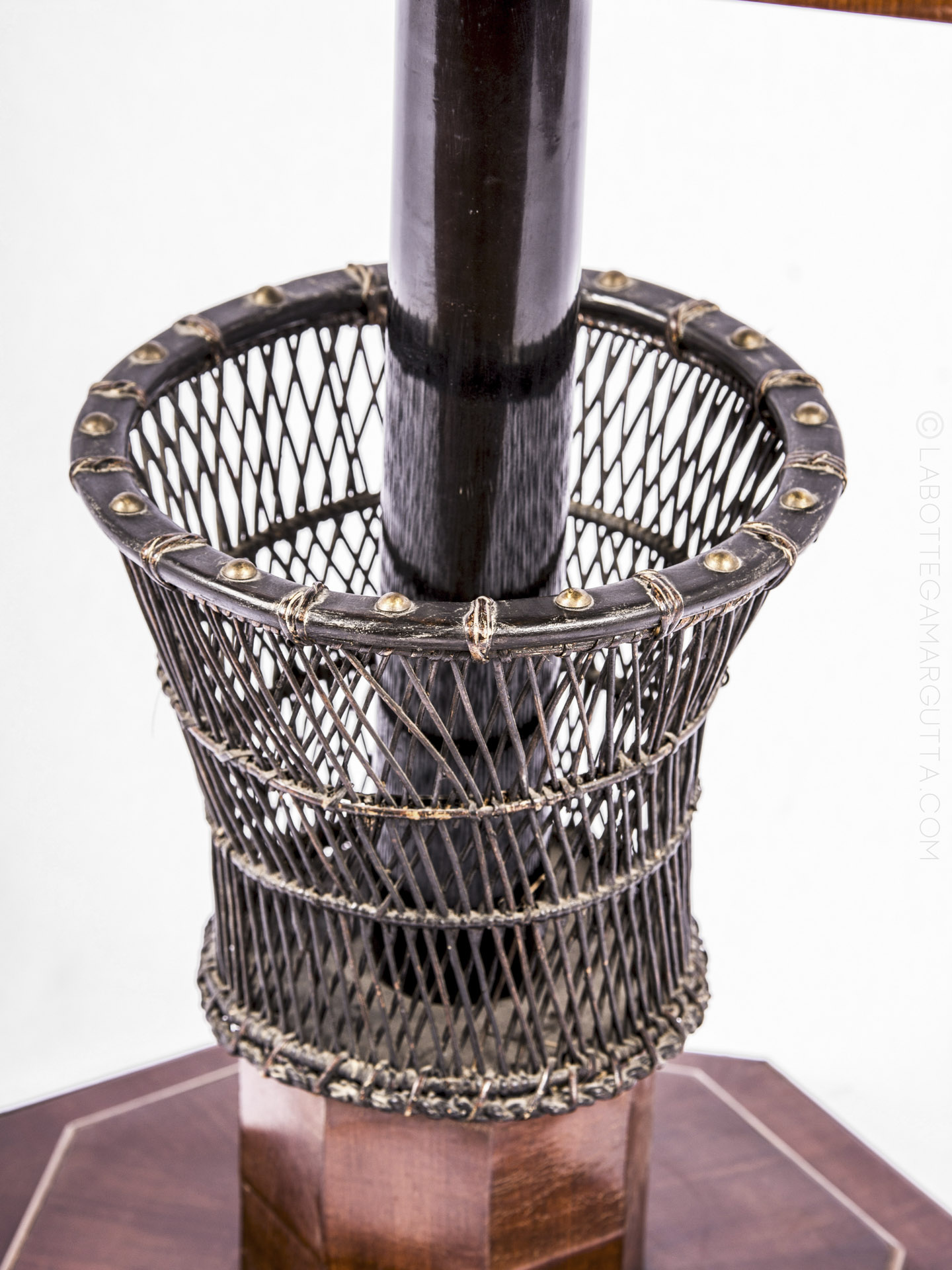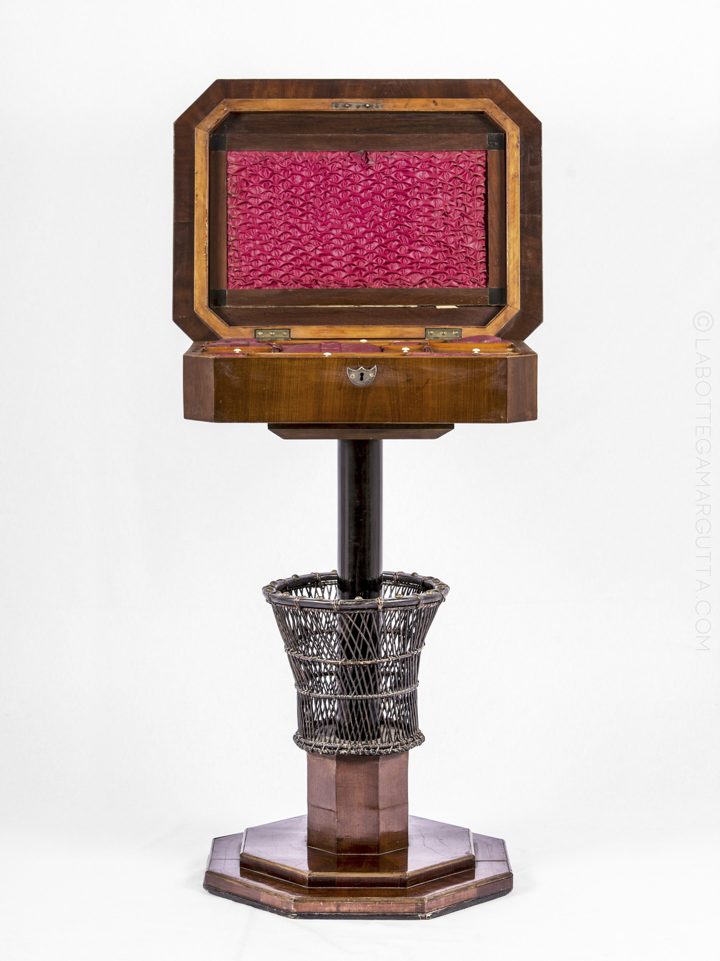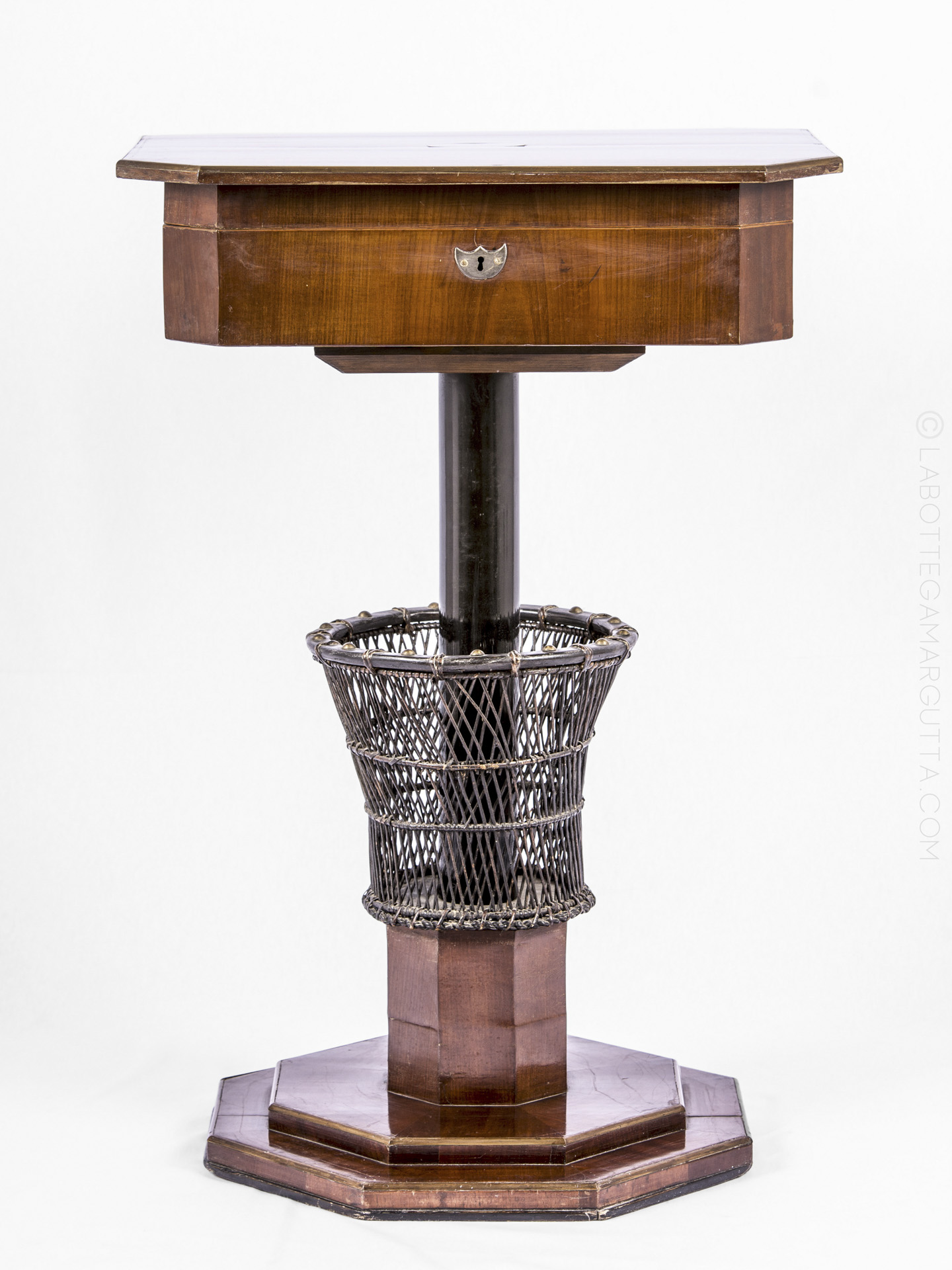 Tavolo da lavoro in mogano con cestino centrale di raccolta. Inghilterra, epoca Regency, inizi ‘800