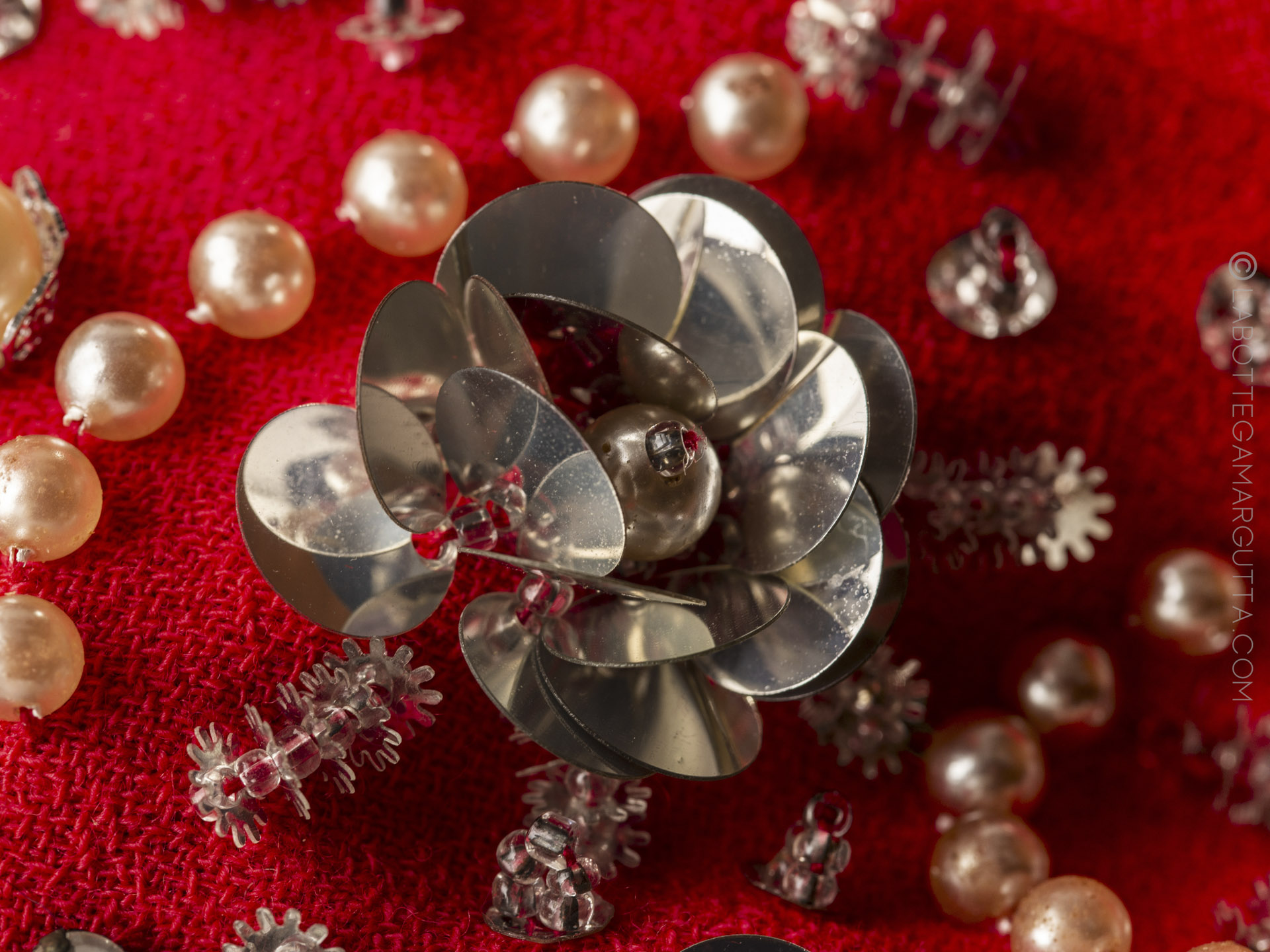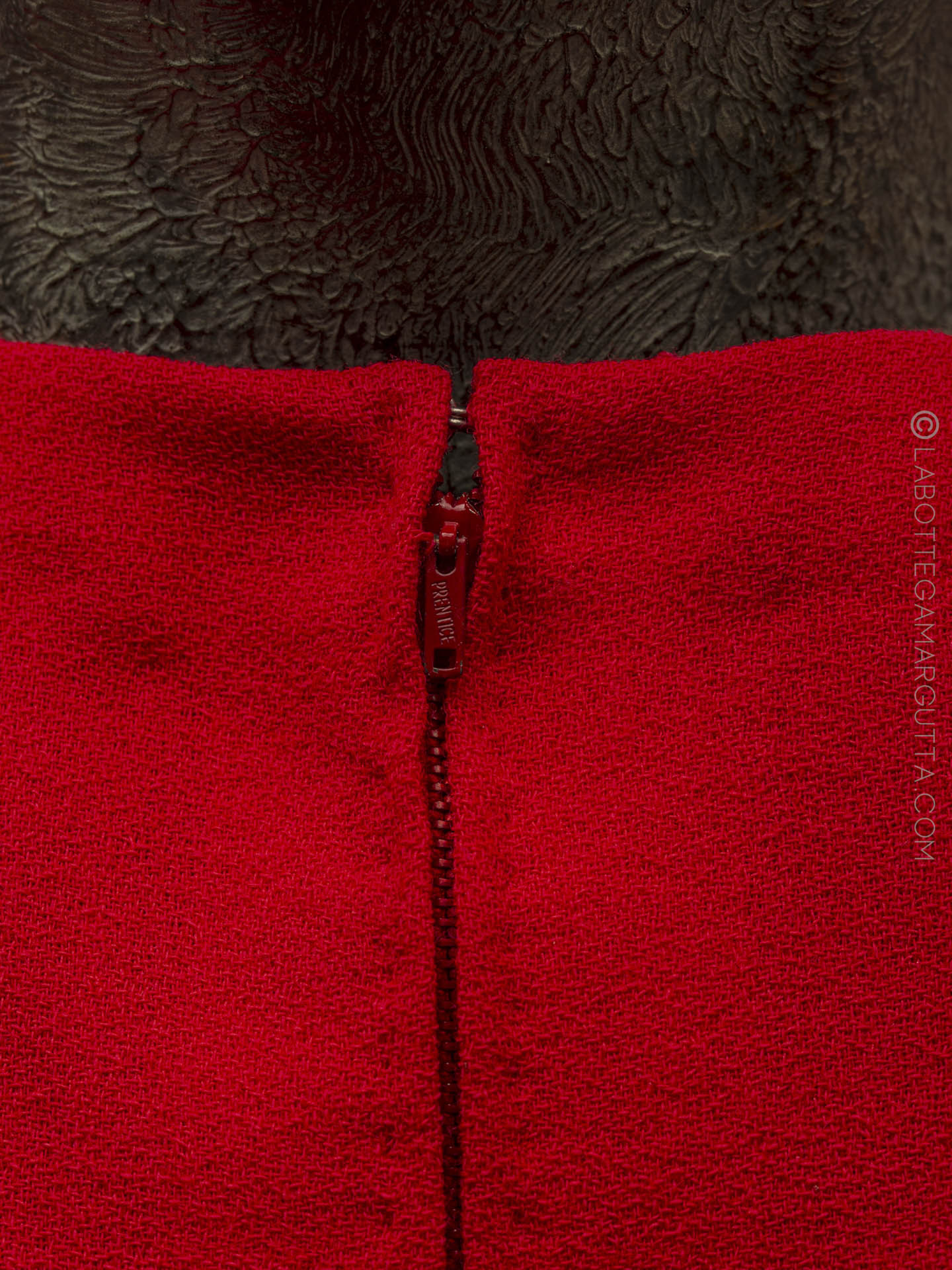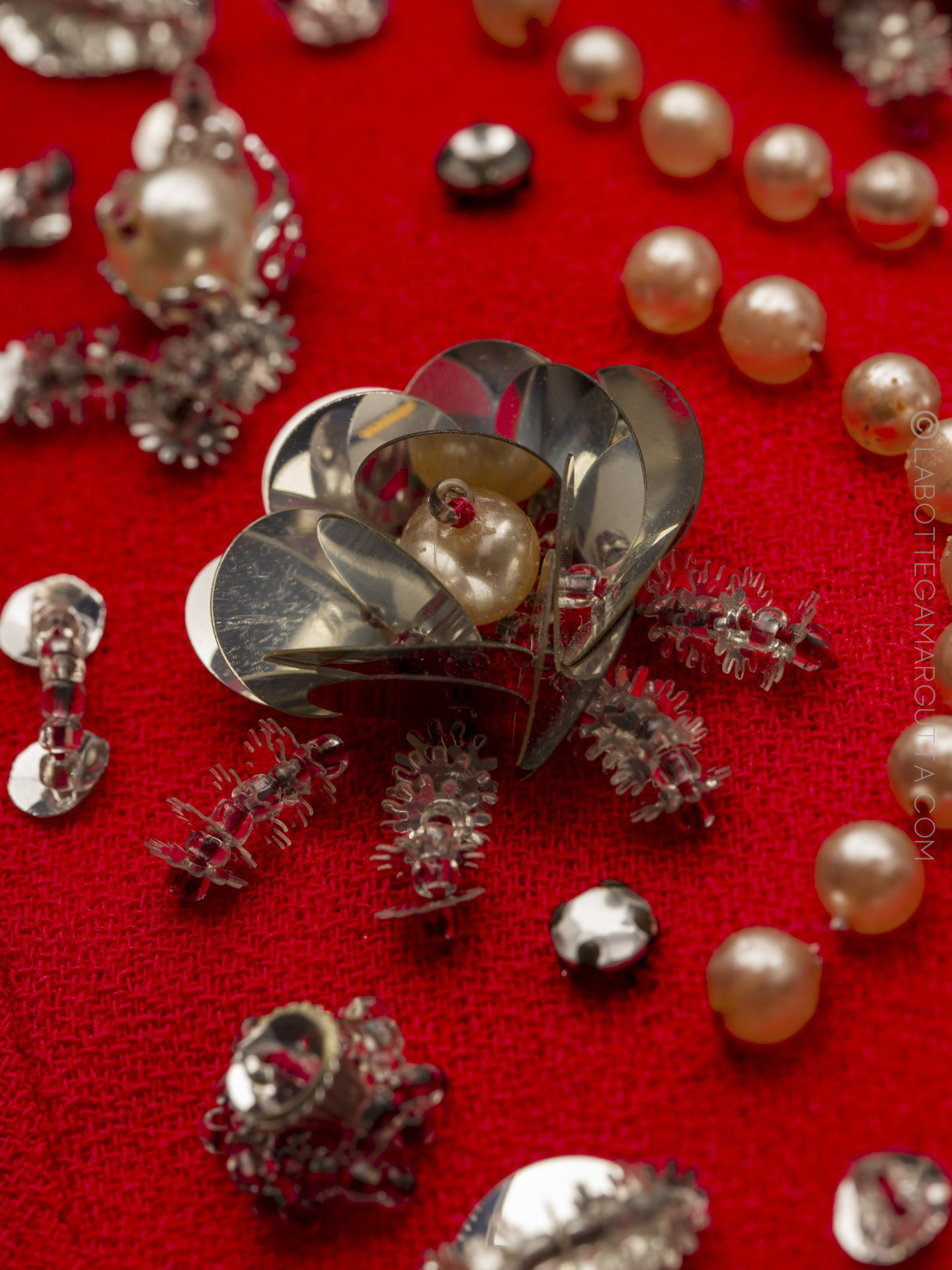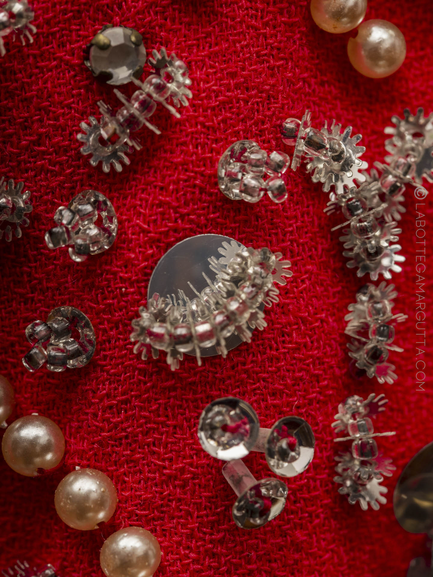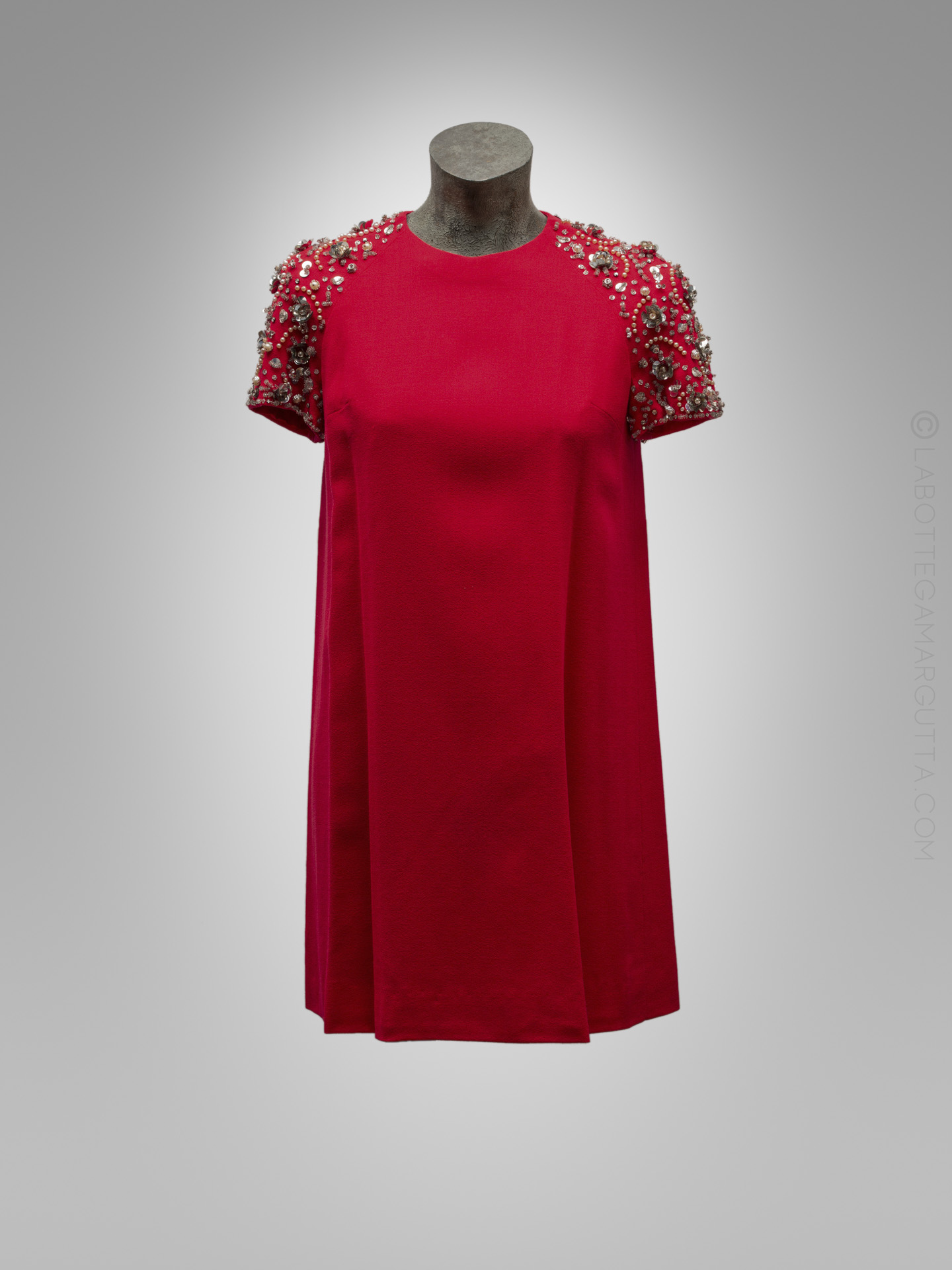 Abito da cocktail in cady rosso e maniche ricamate in strasse e pailletes.
